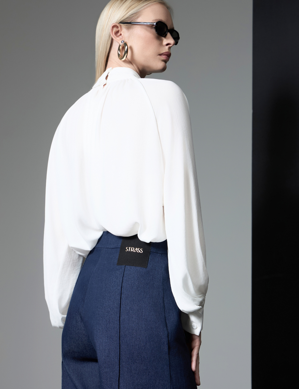 Apresenta modelagem reta e comprimento padrão . O modelo conta com gola alta com leves franzidos , que acompanham o corpo da blusa e valorizam o design. Possui mangas longas largas com punhos largos , além de fechamento por abotoamento na gola costas , que adiciona sofisticação ao visual.