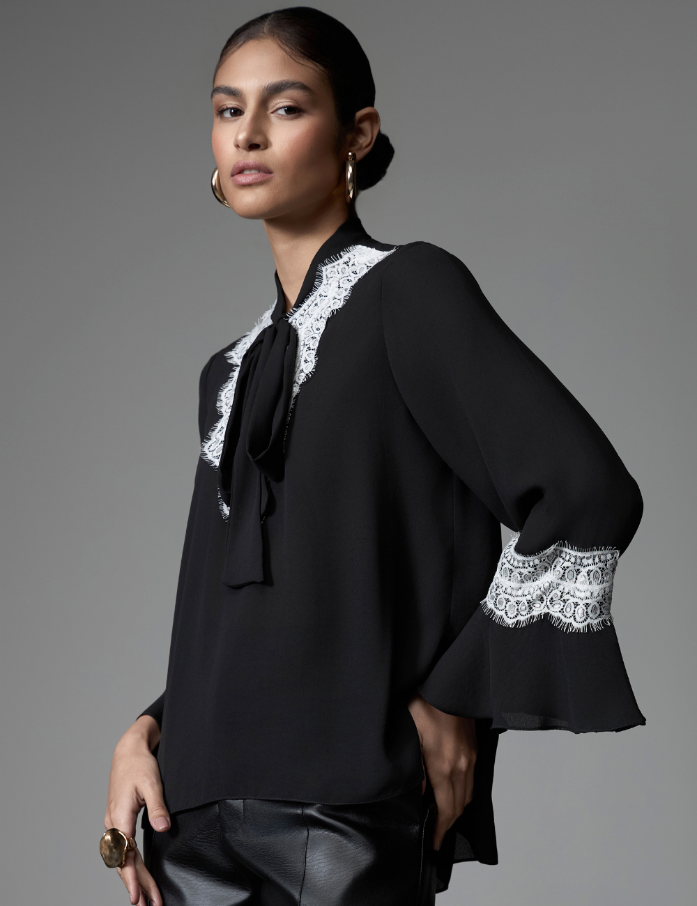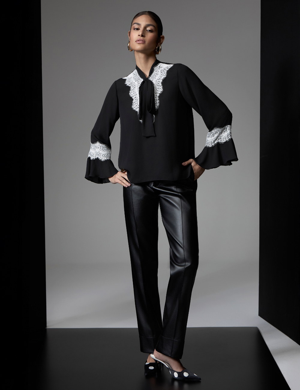 A blusa preta com detalhe em renda é confeccionada em crepe, um tecido leve e confortável que garante elegância e fluidez ao visual.
