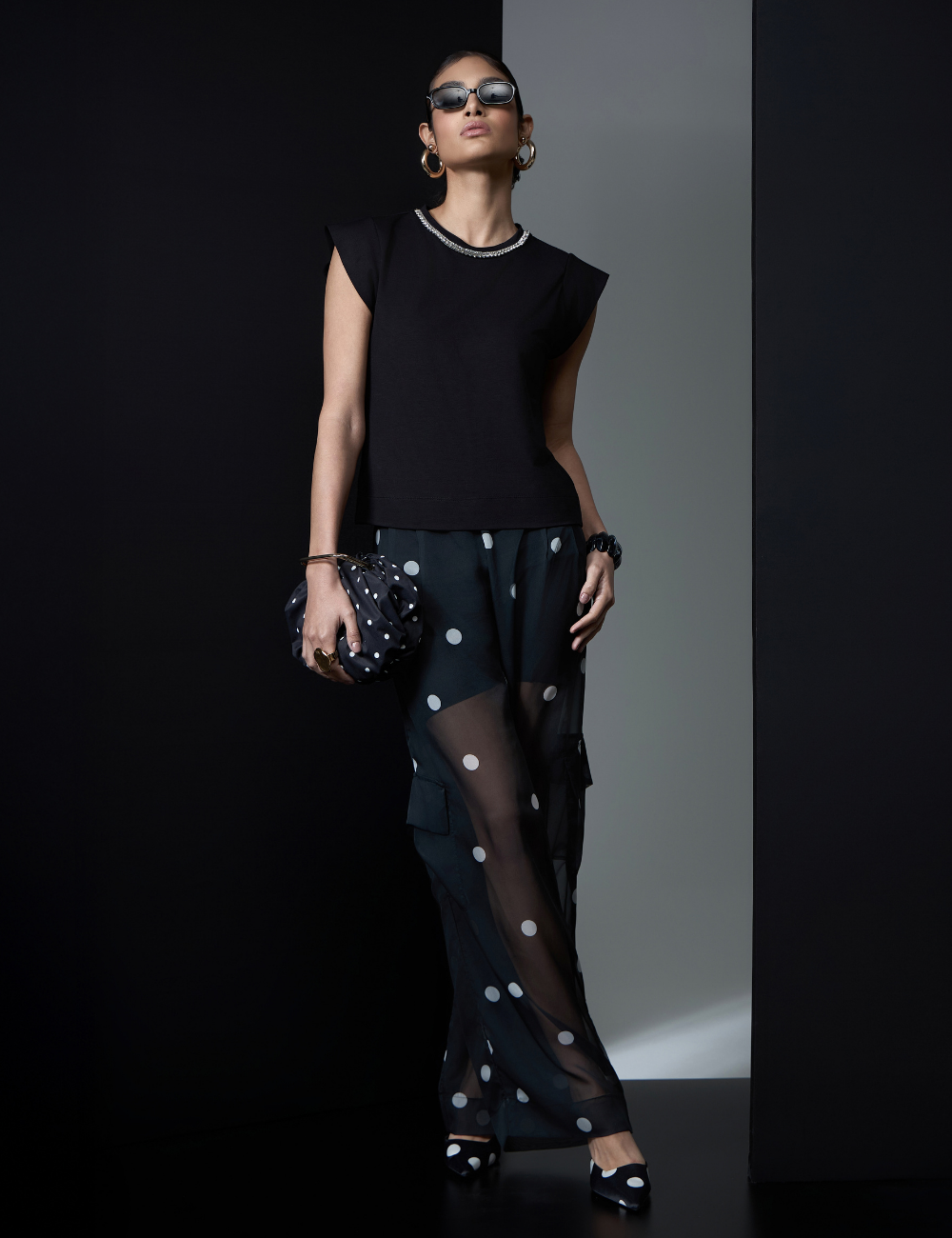 A calça de poás preta é confeccionada em gazar, um tecido leve e com transparência que confere um visual sofisticado e atual.
