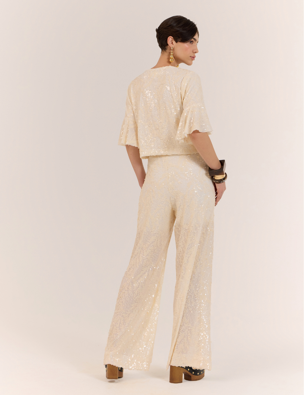 A calça off white em paetês é confeccionada em tule com paetês bordados , um tecido leve e confortável que garante brilho delicado e caimento sofisticado .