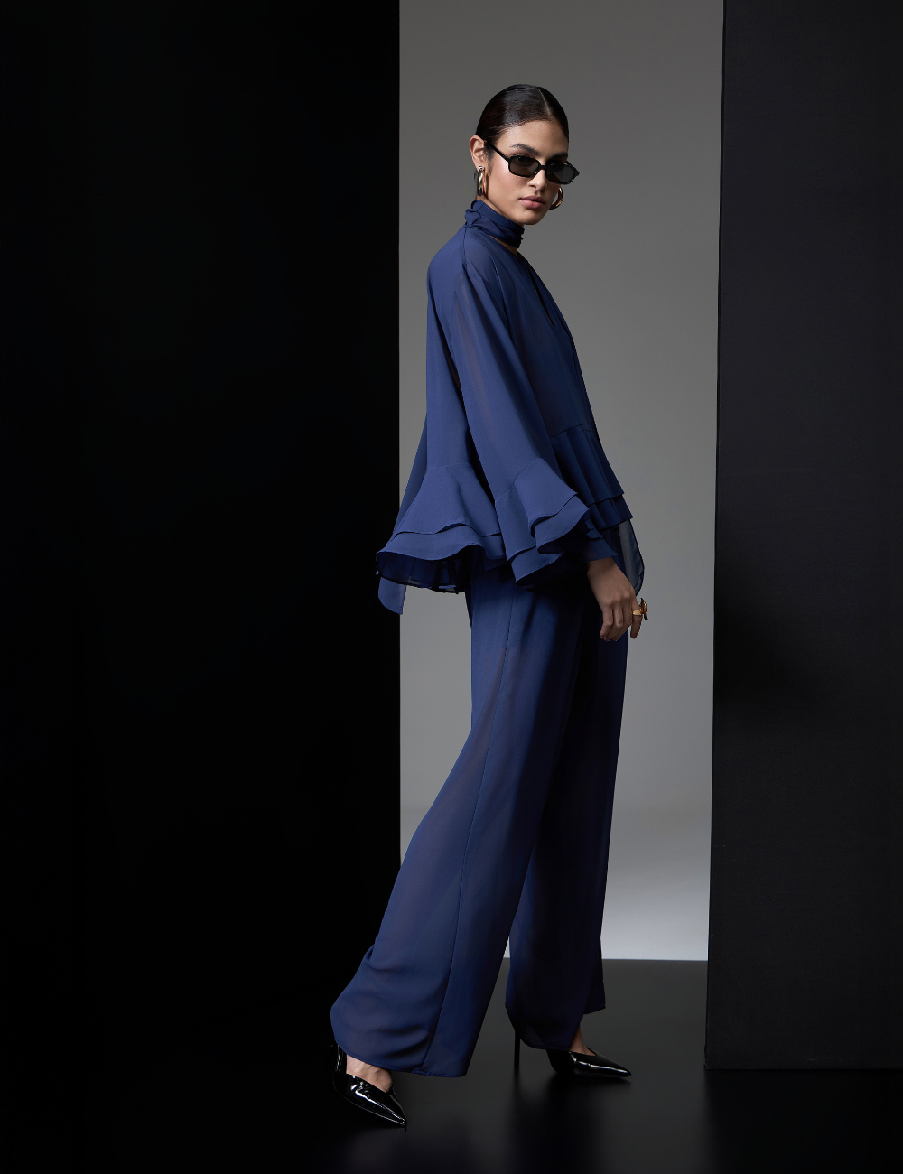 A calça pantalona azul marinho é confeccionada em chiffon. O tecido leve e confortável garante caimento fluido, proporcionando movimento e sofisticação ao visual.