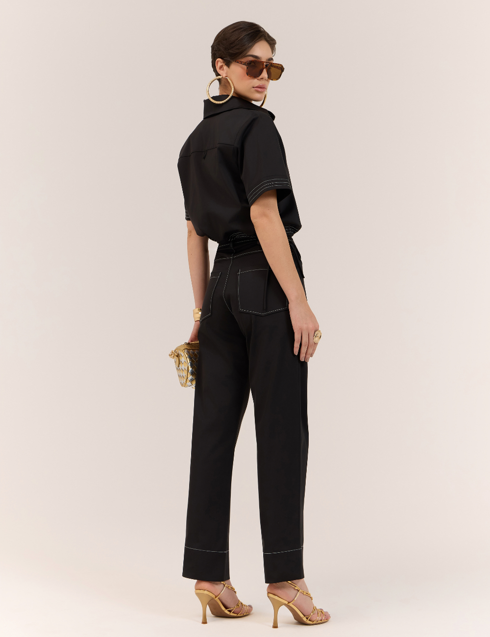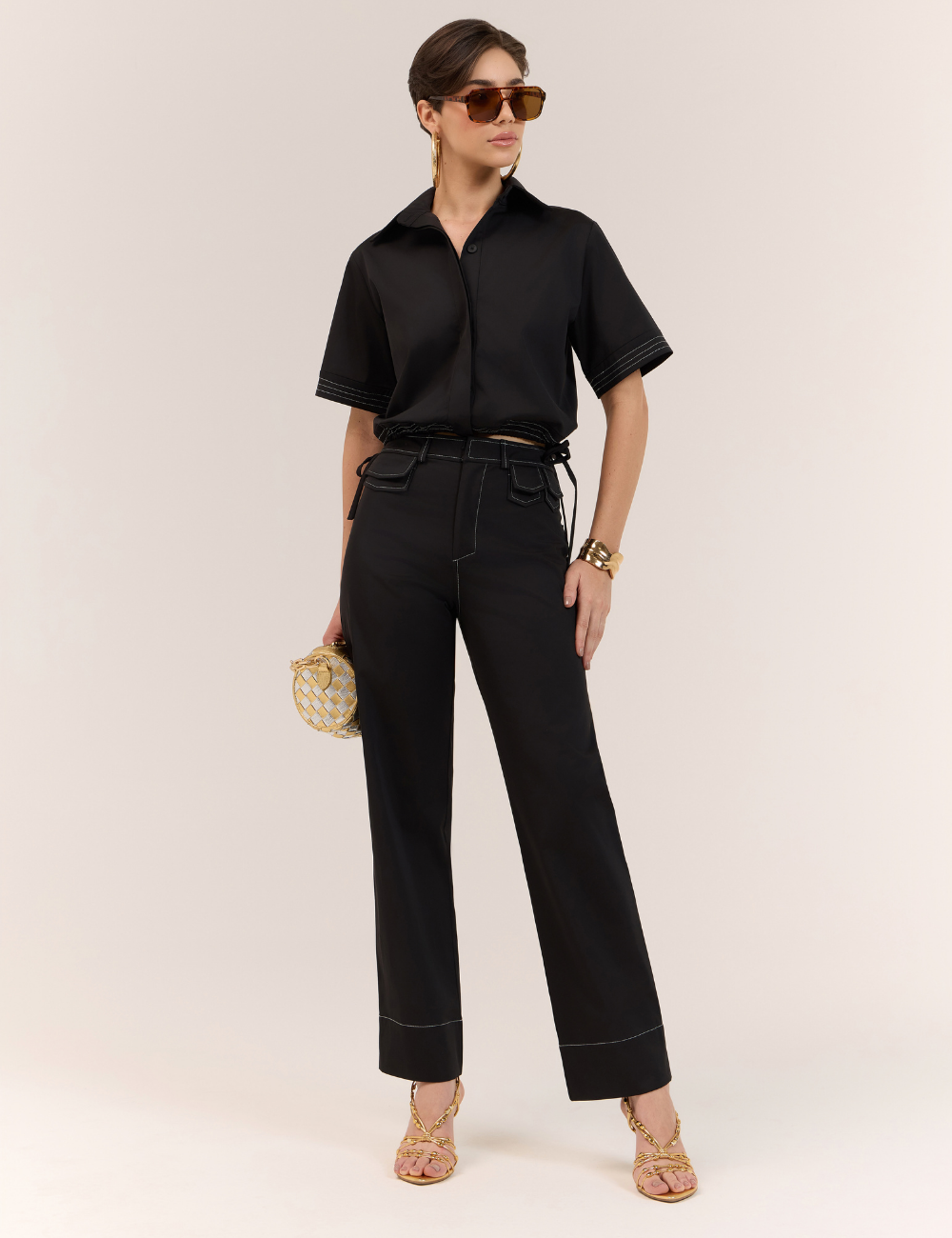 A calça reta preta pespontada é confeccionada em algodão com poliéster. O tecido é estruturado e confortável, garantindo caimento impecável e praticidade no uso.