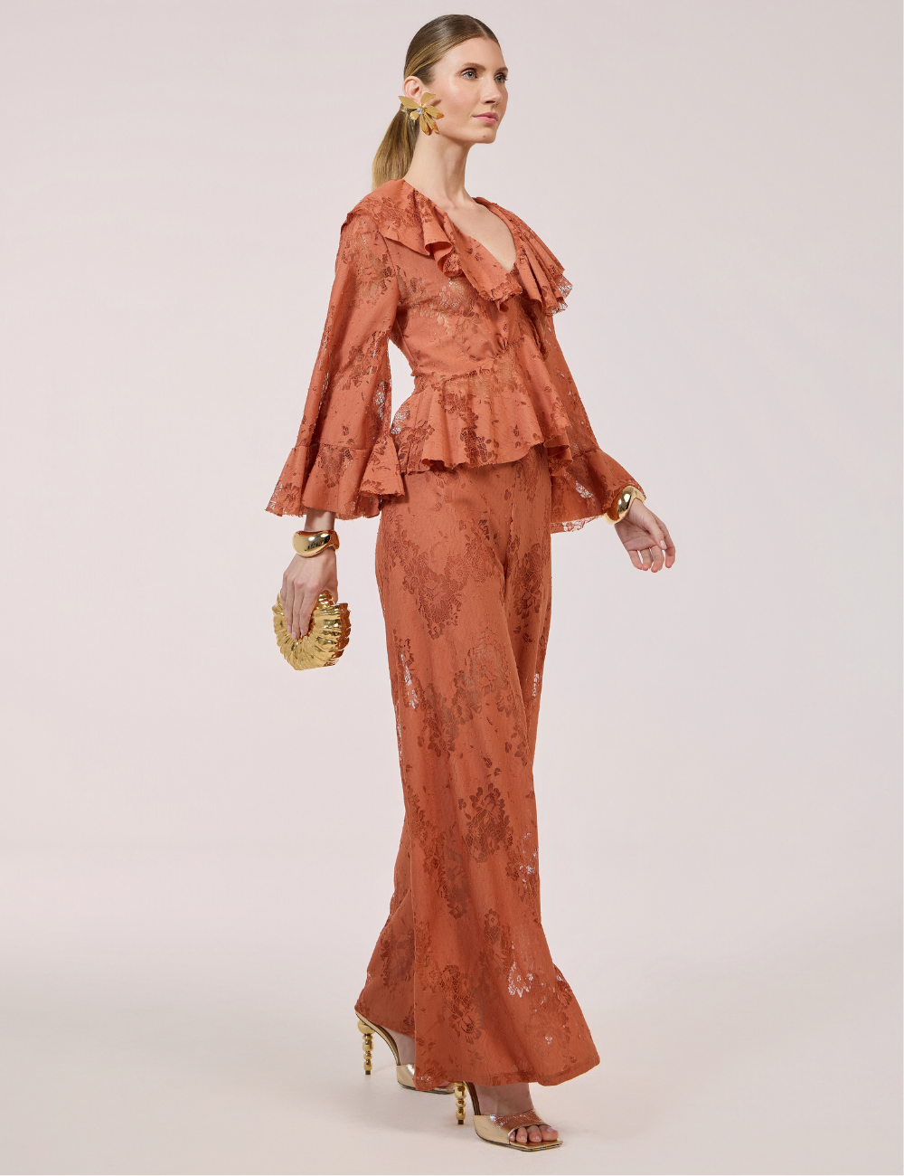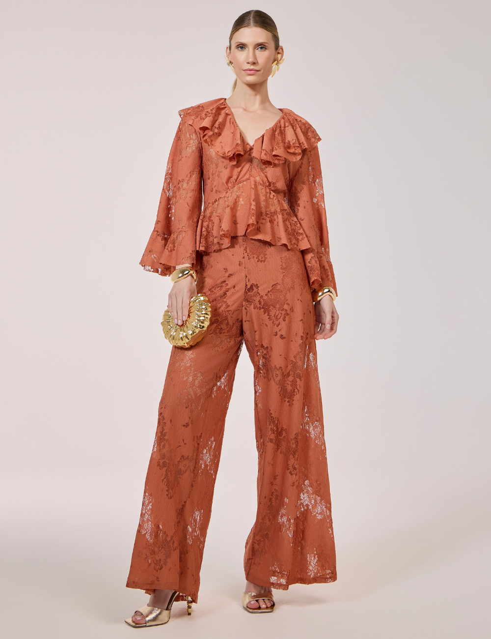 A calça terracota em renda é confeccionada em renda chantilly, com detalhes delicados no tecido que conferem sofisticação e leveza ao visual.
