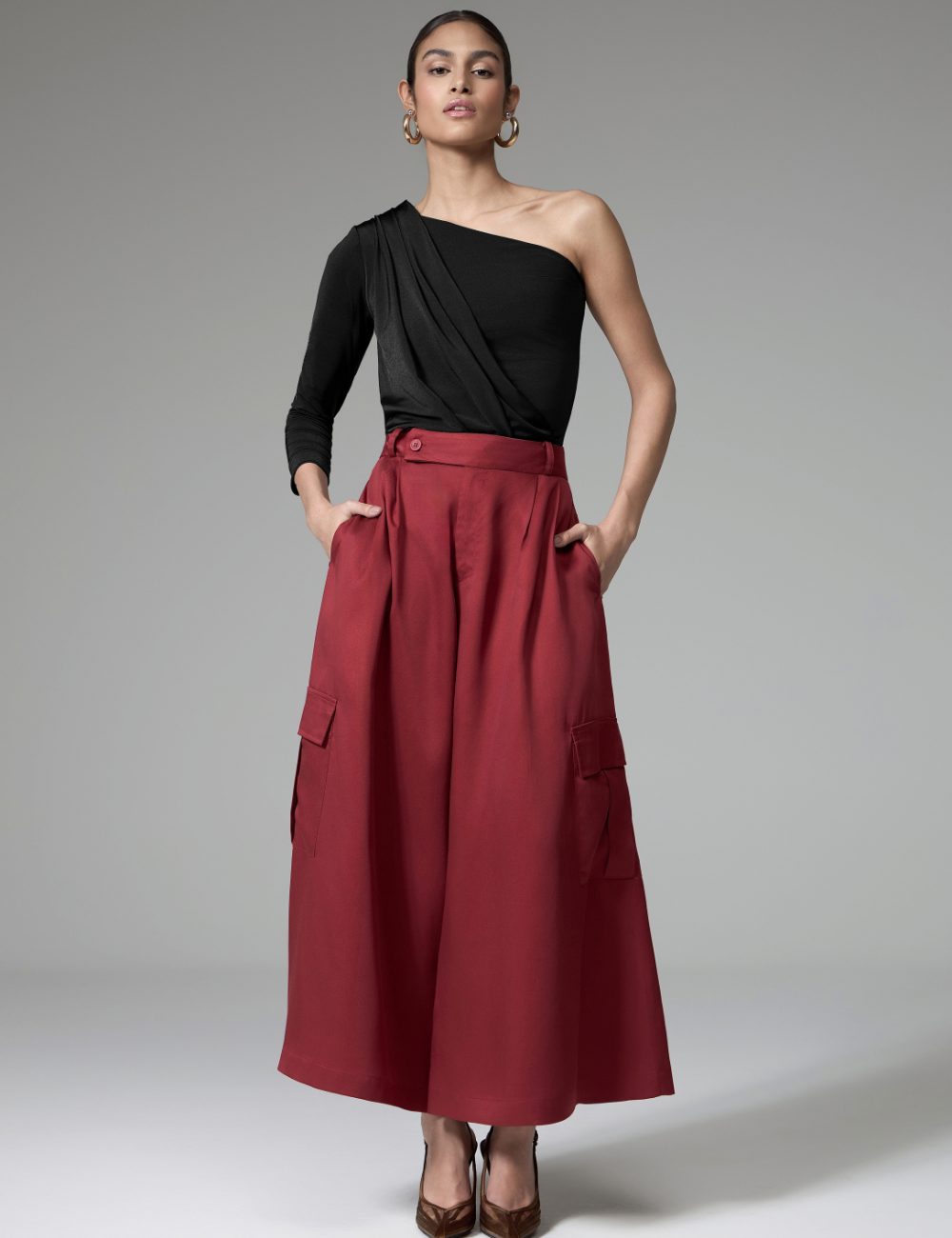 A peça apresenta modelagem pantacourt e shape amplo, garantindo caimento moderno e elegante. Possui cintura alta, cós largo, pregas frontais, bolso faca nas laterais, bolsos utilitários nas pernas e fechamento por zíper e colchete na frente, assegurando praticidade e acabamento refinado.