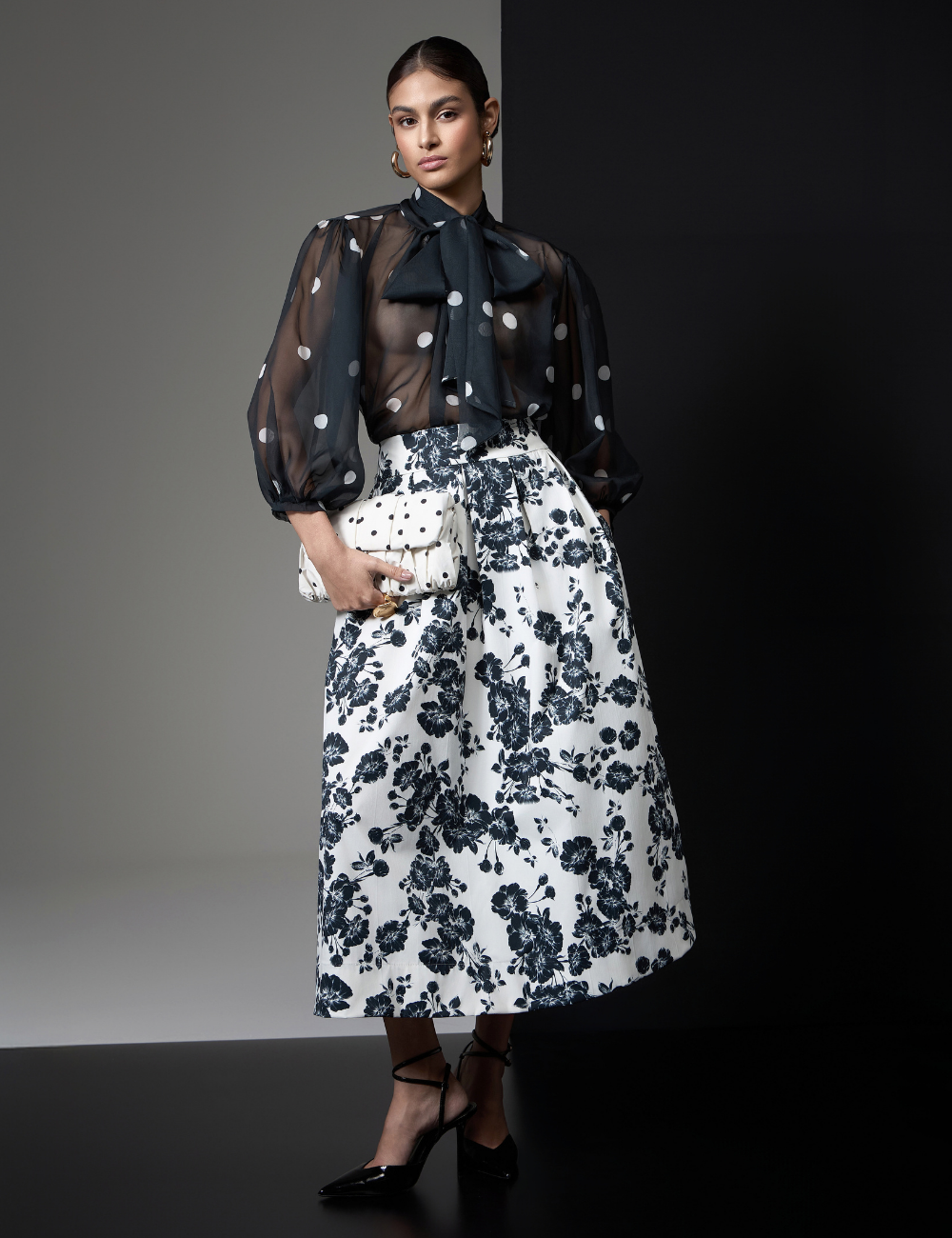 A camisa de poás preta é confeccionada em gazar, um tecido leve e com transparência que garante um visual sofisticado e delicado.