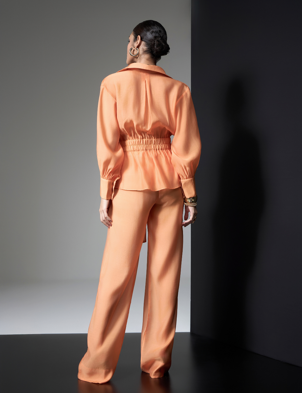 A camisa laranja com amarração é confeccionada em lyocell. O tecido leve, com transparência sutil, garante caimento fluido e adiciona sofisticação ao visual.