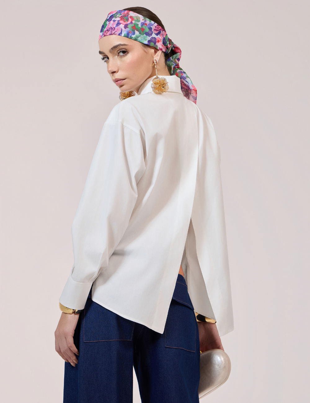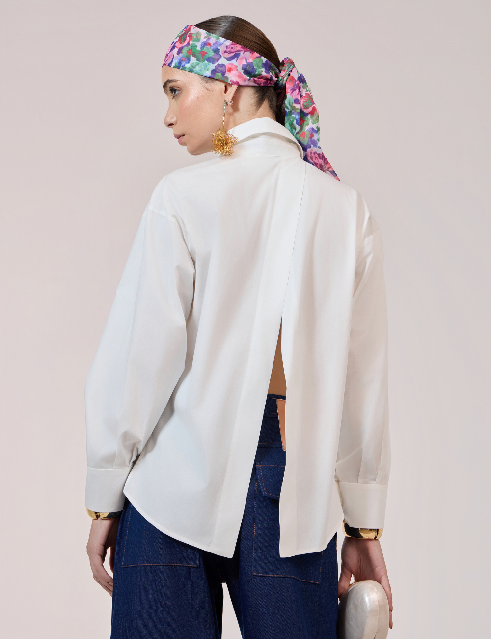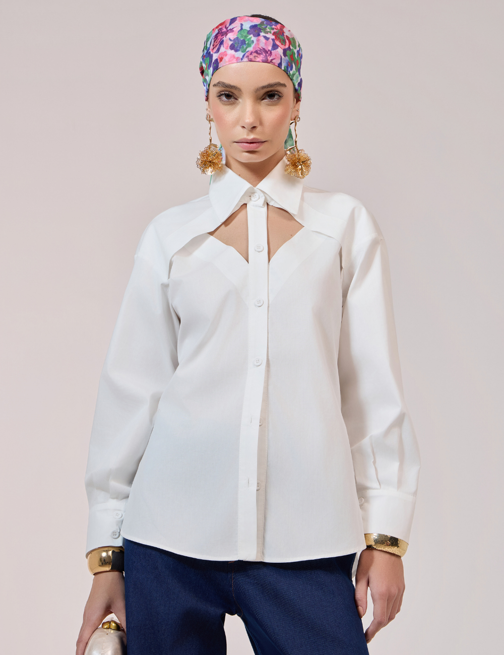 A camisa off white cut out é confeccionada em algodão. O tecido é estruturado e confortável, ideal para compor looks modernos com elegância.