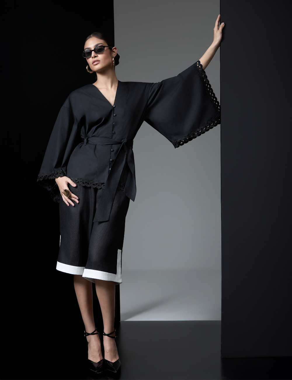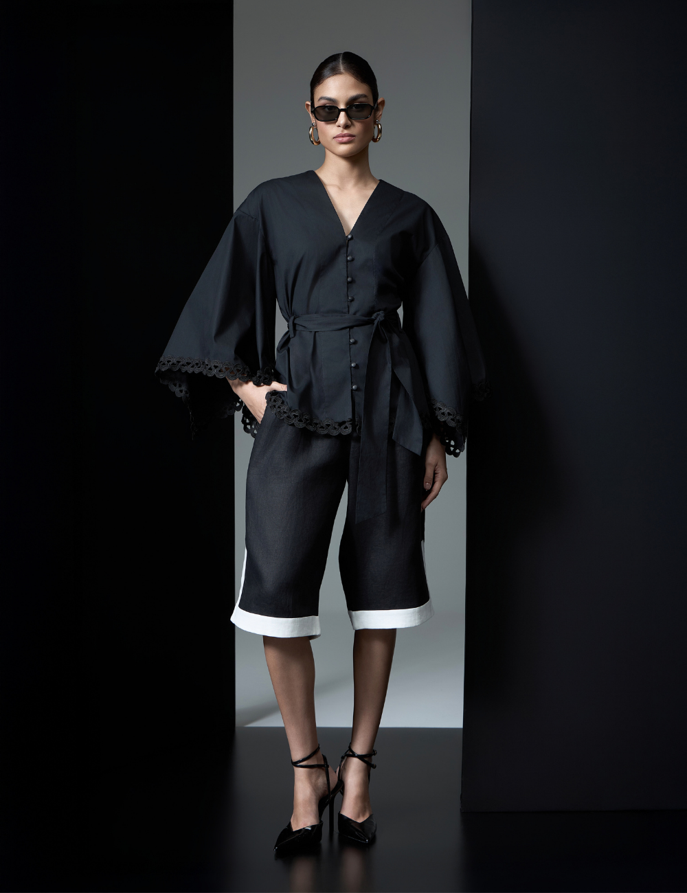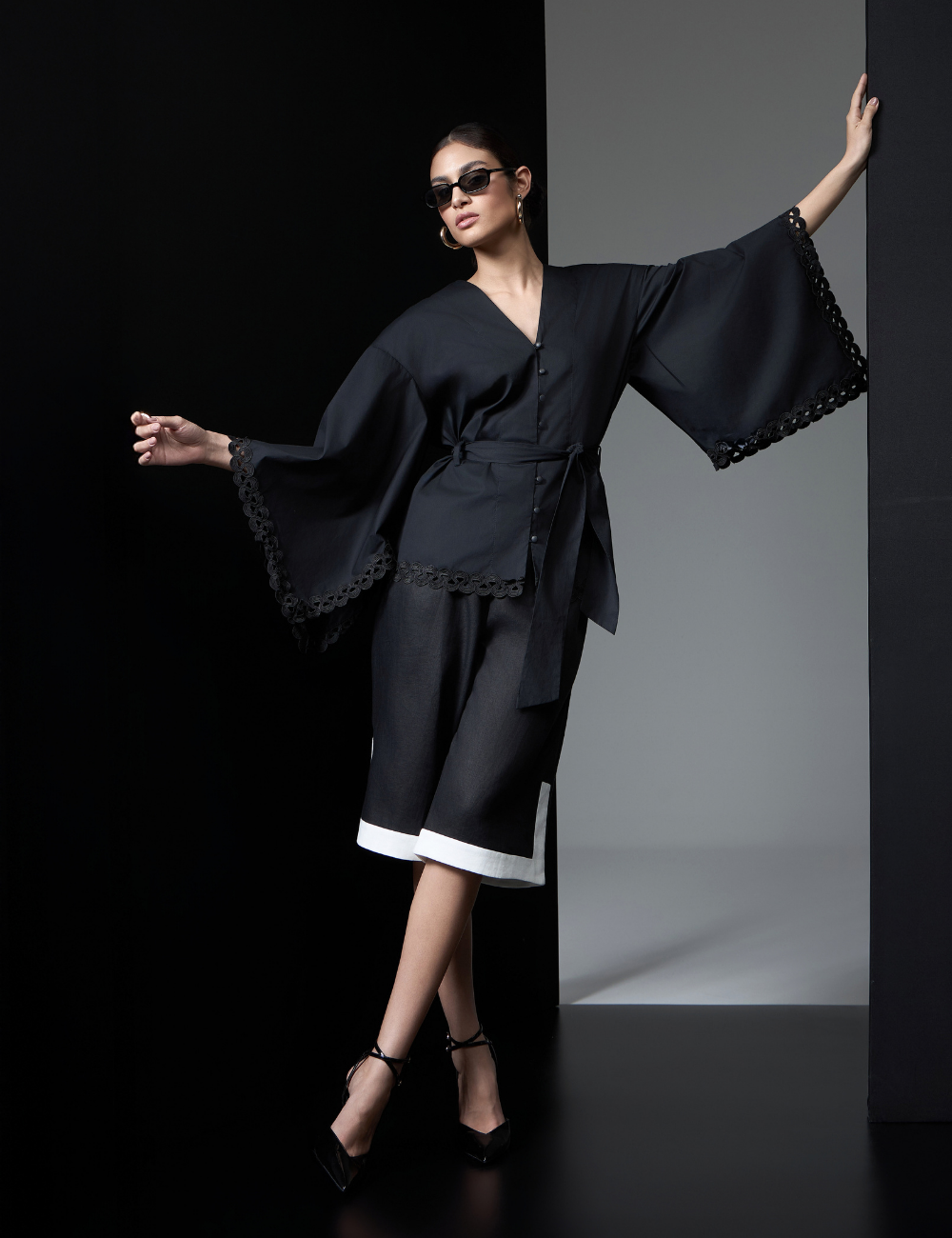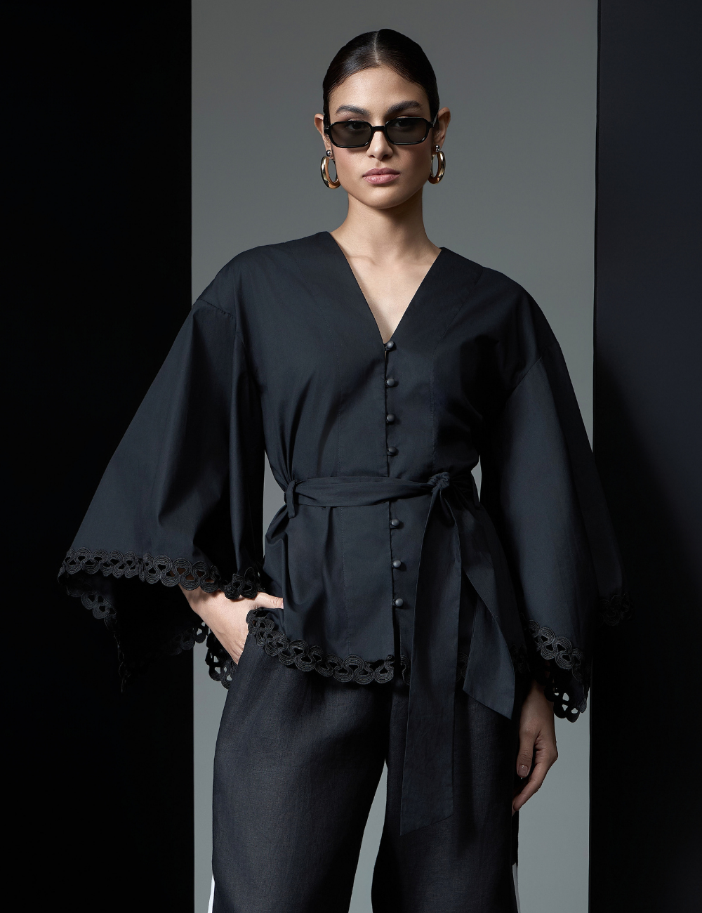 A camisa preta com mangas amplas é confeccionada em algodão. O tecido estruturado e confortável garante caimento impecável e traz elegância ao visual.