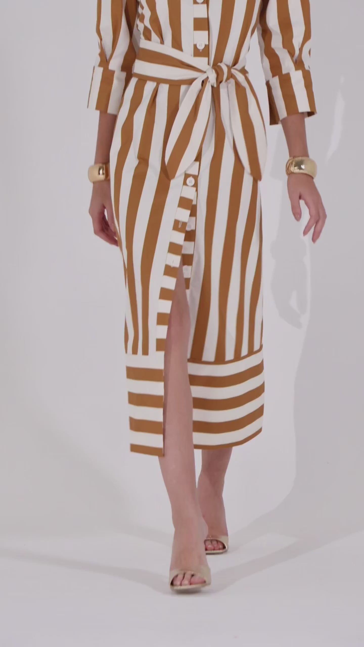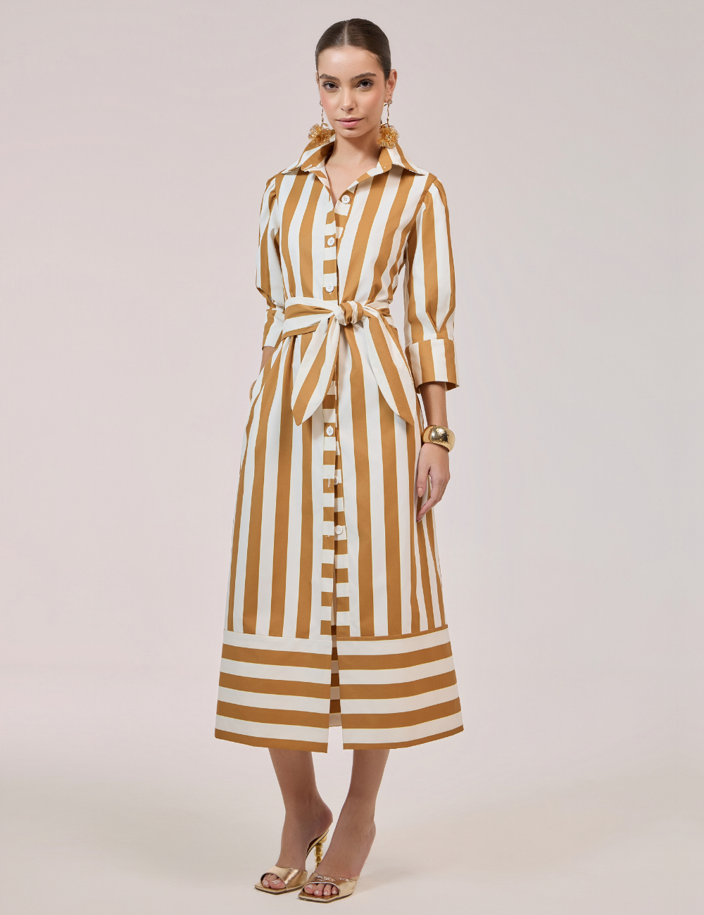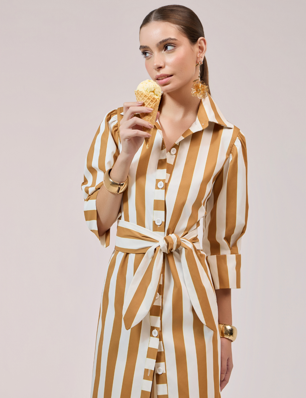 A chemise listrada bege com faixa é confeccionada em sarja com padronagem listrada. O tecido é estruturado e confortável, garantindo um caimento elegante e moderno.