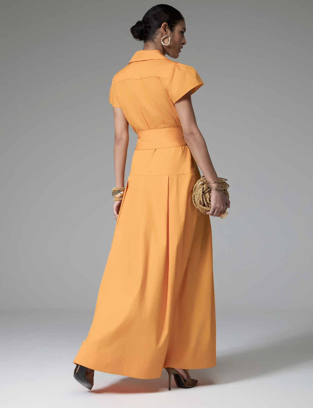O chemise longo laranja com pedrarias é confeccionado em algodão, proporcionando conforto e caimento leve.