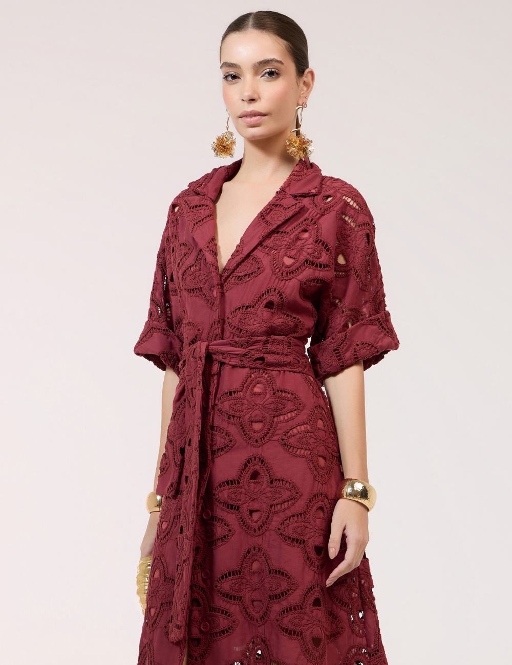 A chemise marrom com bordados é confeccionada em algodão com poliéster. O tecido estruturado ganha destaque com os bordados delicados e aplicações em renda de entremeio, que conferem um toque artesanal e sofisticado à peça.