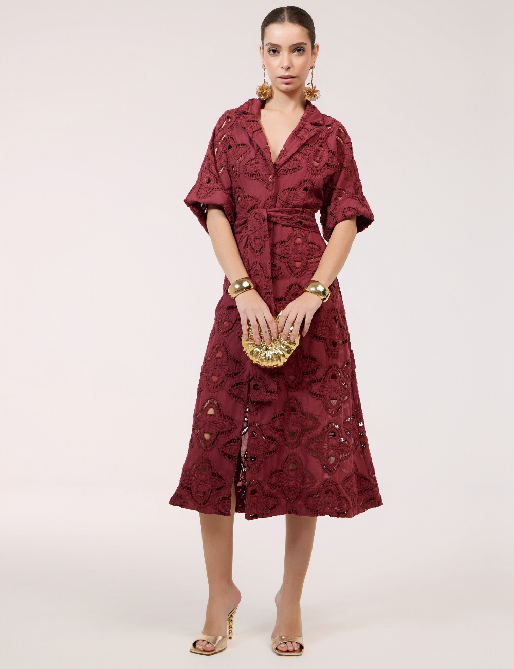 Com modelagem evasê e comprimento midi, a chemise possui colarinho clássico, mangas 3/4 e forro embutido, garantindo conforto e acabamento refinado. O fechamento por abotoamento frontal facilita o uso no dia a dia. Acompanha faixa para amarração na cintura, que valoriza a silhueta.