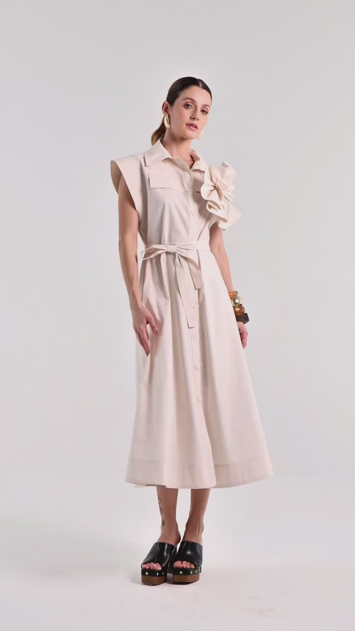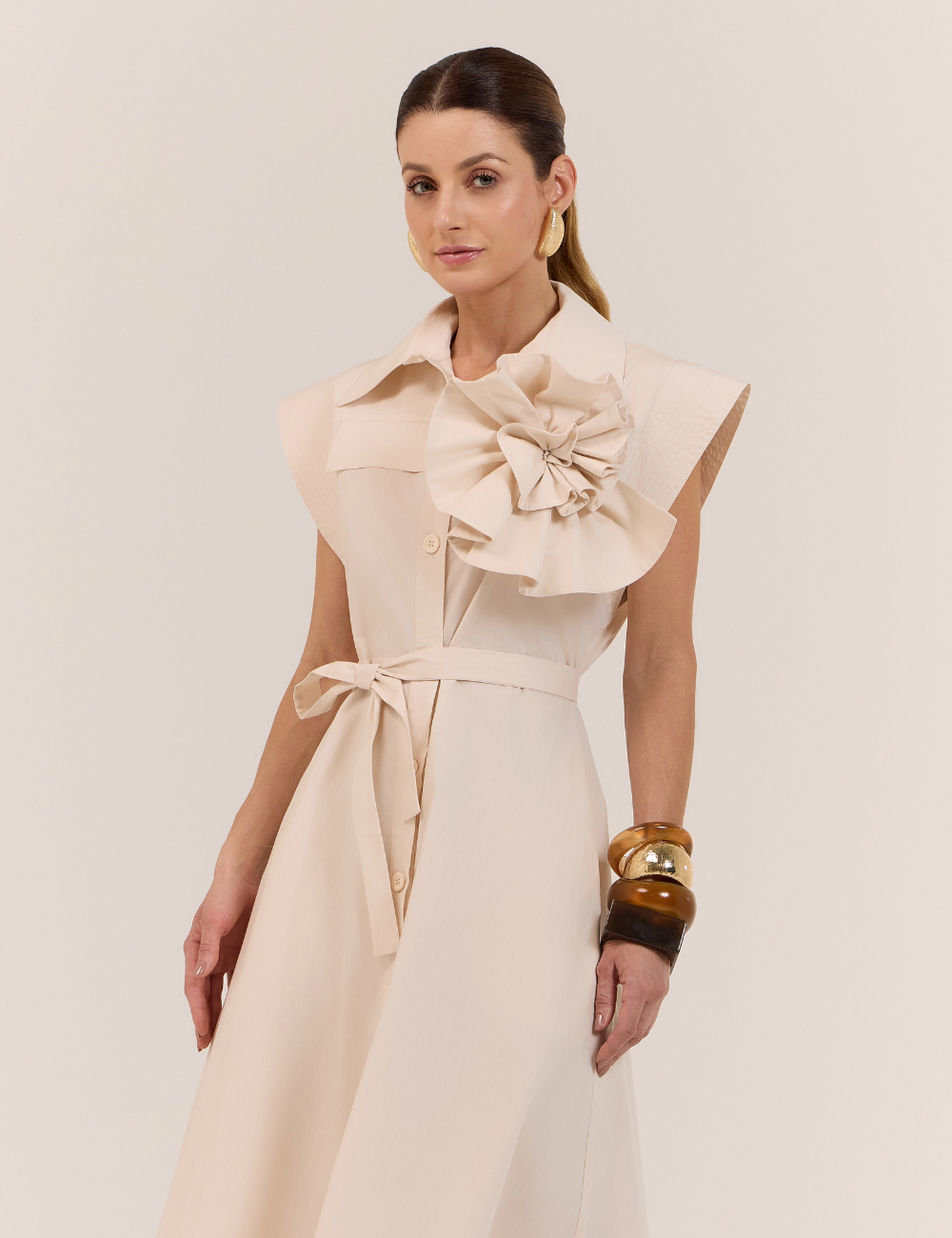 A chemise midi bege com maxi flor é confeccionada em tricoline, um tecido leve e confortável que oferece toque suave e caimento estruturado.