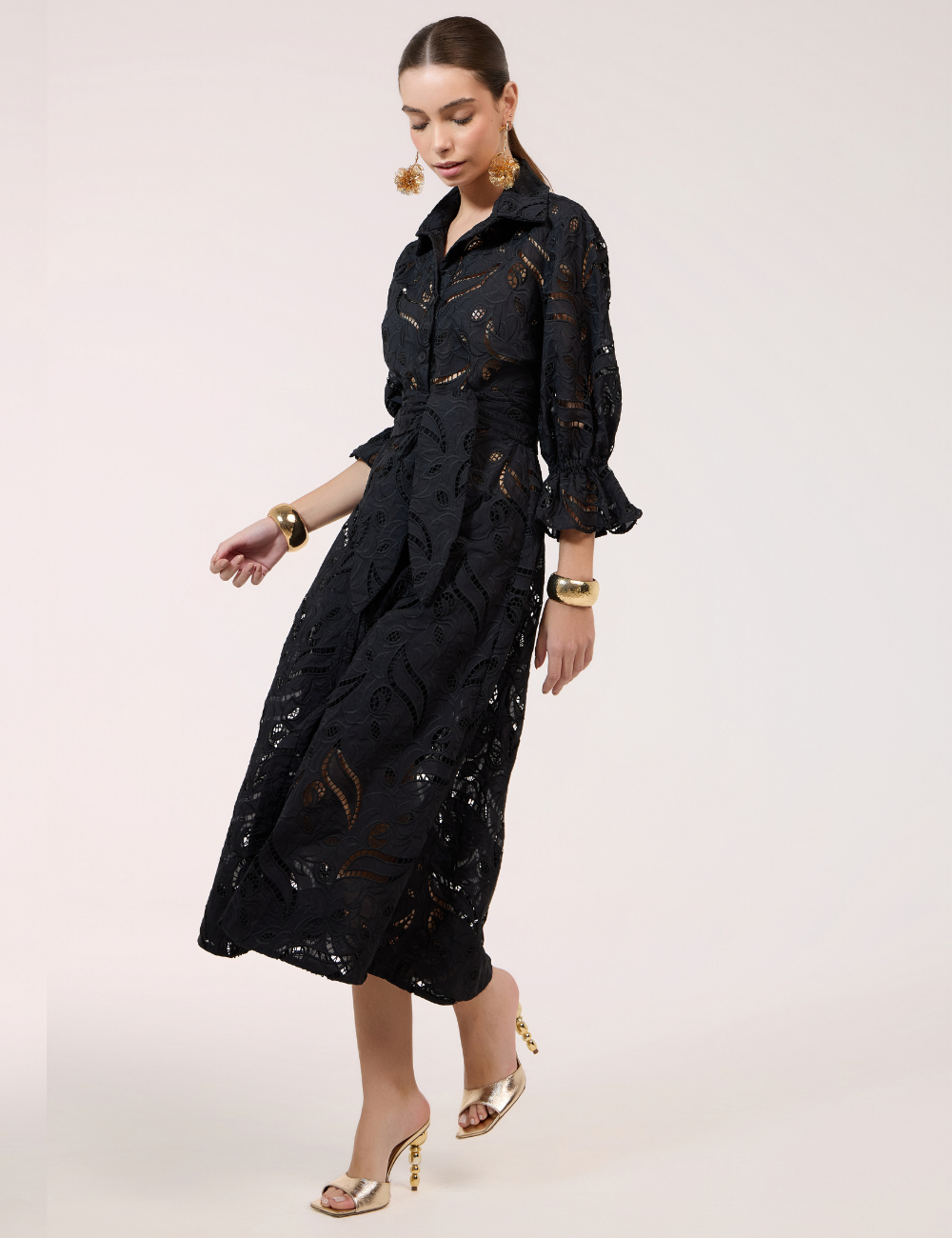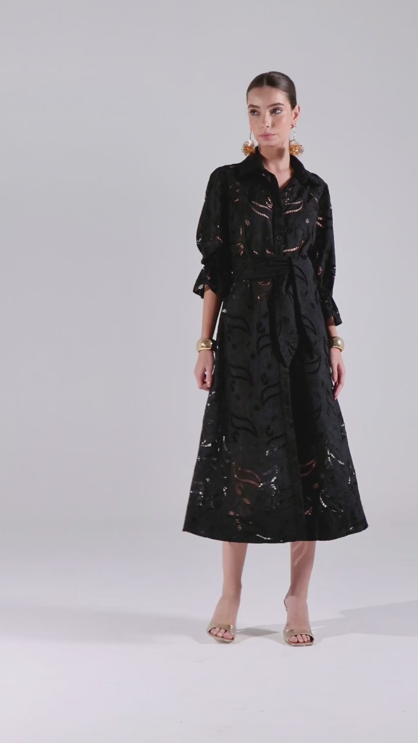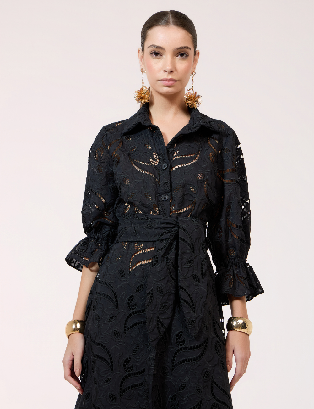A chemise midi preta com bordados vazados é confeccionada em algodão estruturado, que garante elegância com conforto.
