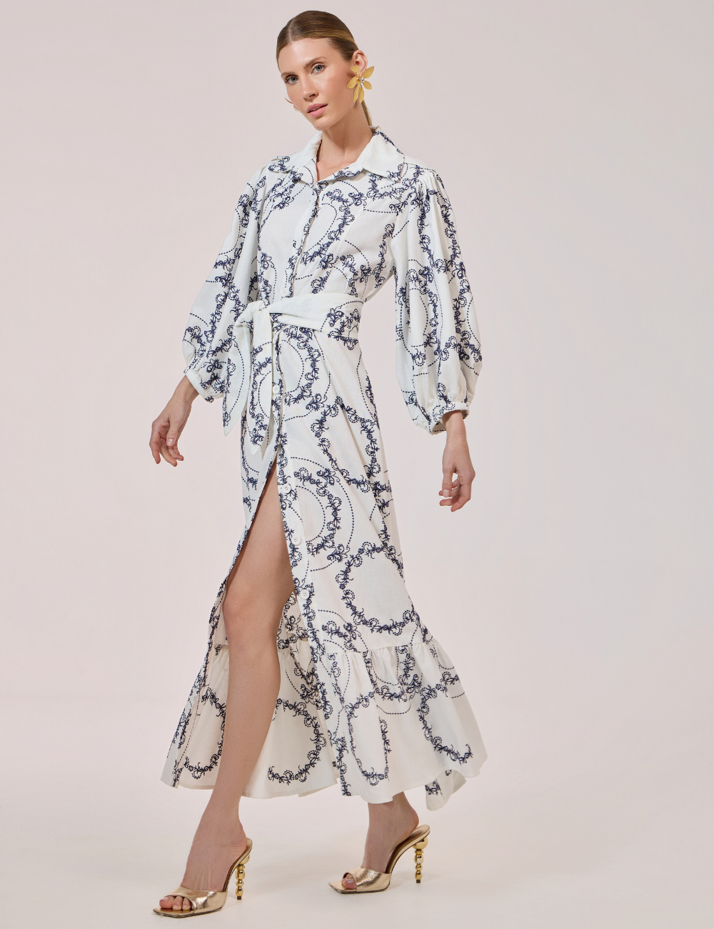 Apresenta modelagem evasê e comprimento longo, garantindo movimento e elegância. Possui colarinho clássico, mangas longas, forro embutido e fechamento por abotoamento frontal. Acompanha faixa para amarração na cintura, permitindo ajustar o caimento conforme o gosto.