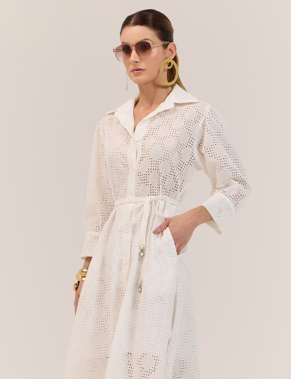 A camisa off white em laise com faixa é confeccionada em algodão . O tecido é leve e confortável , destacando-se pelos detalhes bordados que conferem sofisticação à peça.