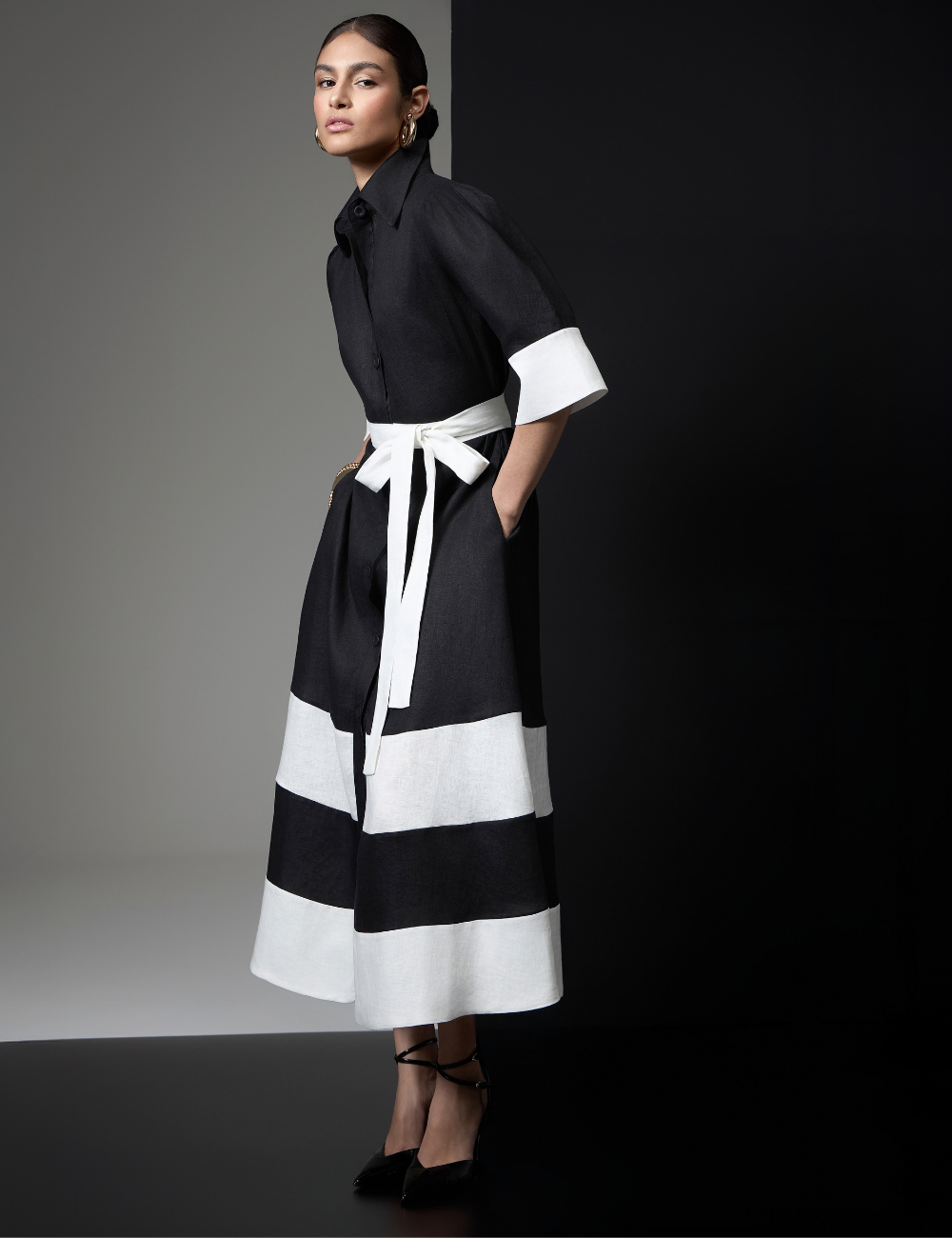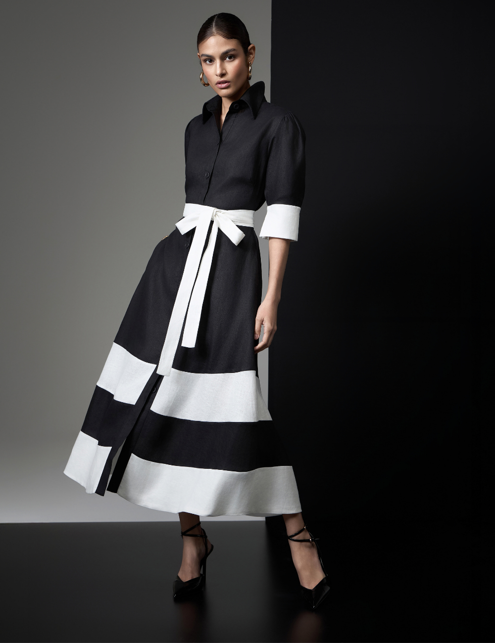 A chemise preta e off white com faixa é confeccionada em linho puro, um tecido fresco e estruturado que garante conforto e elegância ao visual.