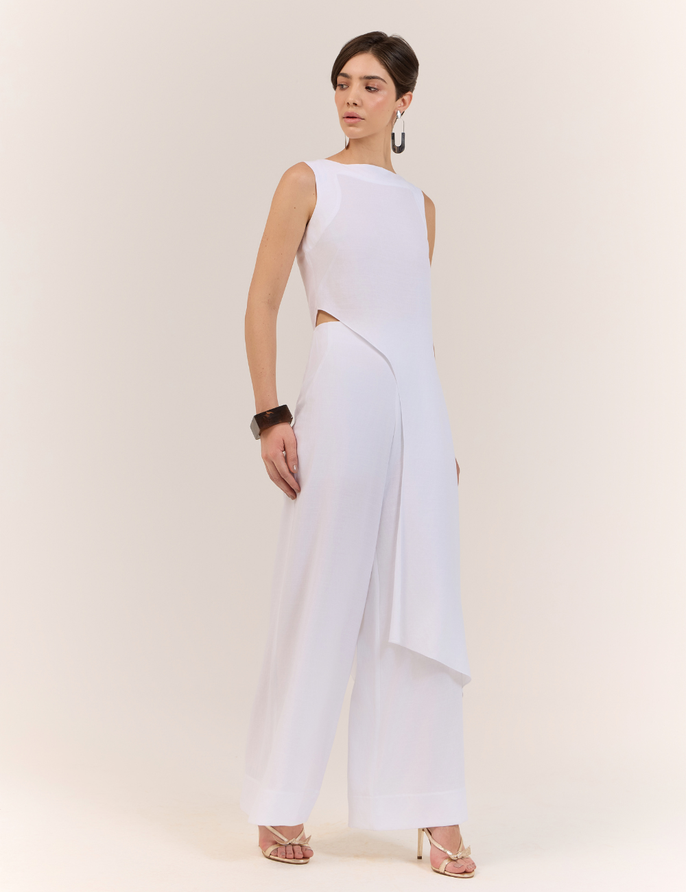 Conjunto assimétrico off white confeccionado em viscose. O tecido é leve e confortável, ideal para composições elegantes com toque moderno. A blusa possui modelagem reta , gola redonda e comprimento assimétrico , trazendo equilíbrio entre sofisticação e estilo contemporâneo. A calça apresenta modelagem reta e shape amplo , com cintura alta , bolso faca nas laterais , forro embutido e fechamento por zíper invisível na lateral .