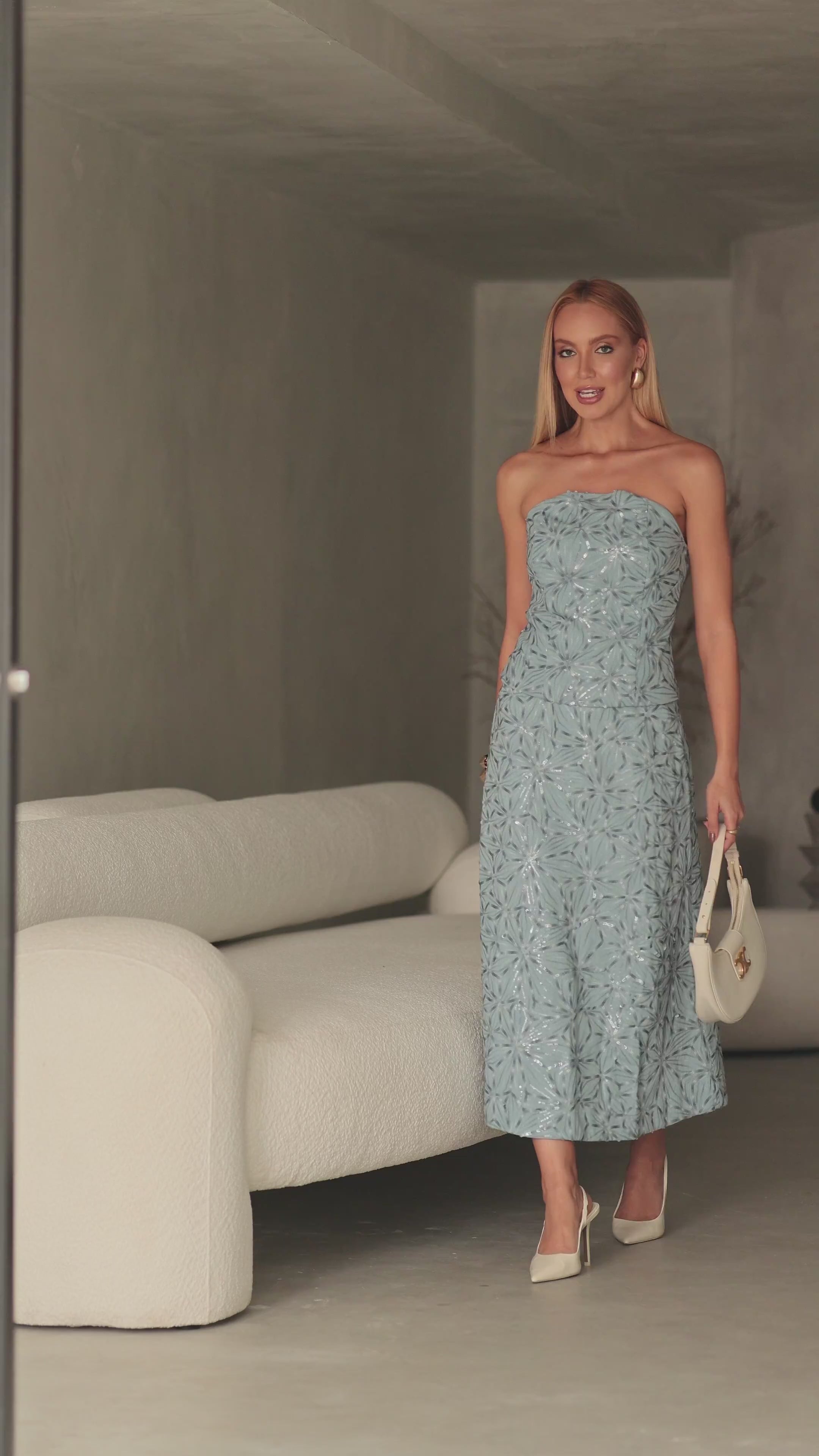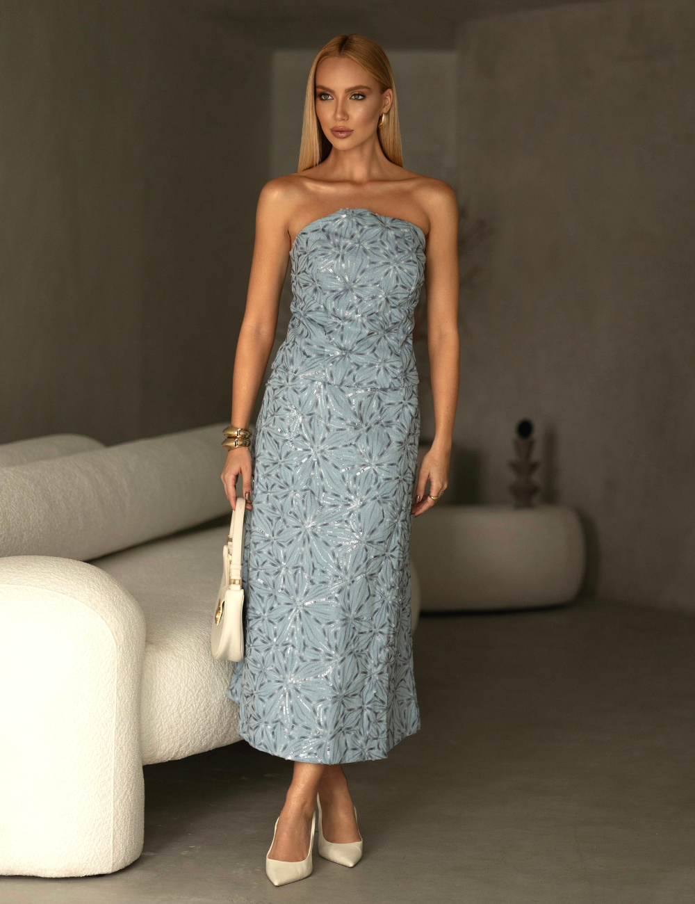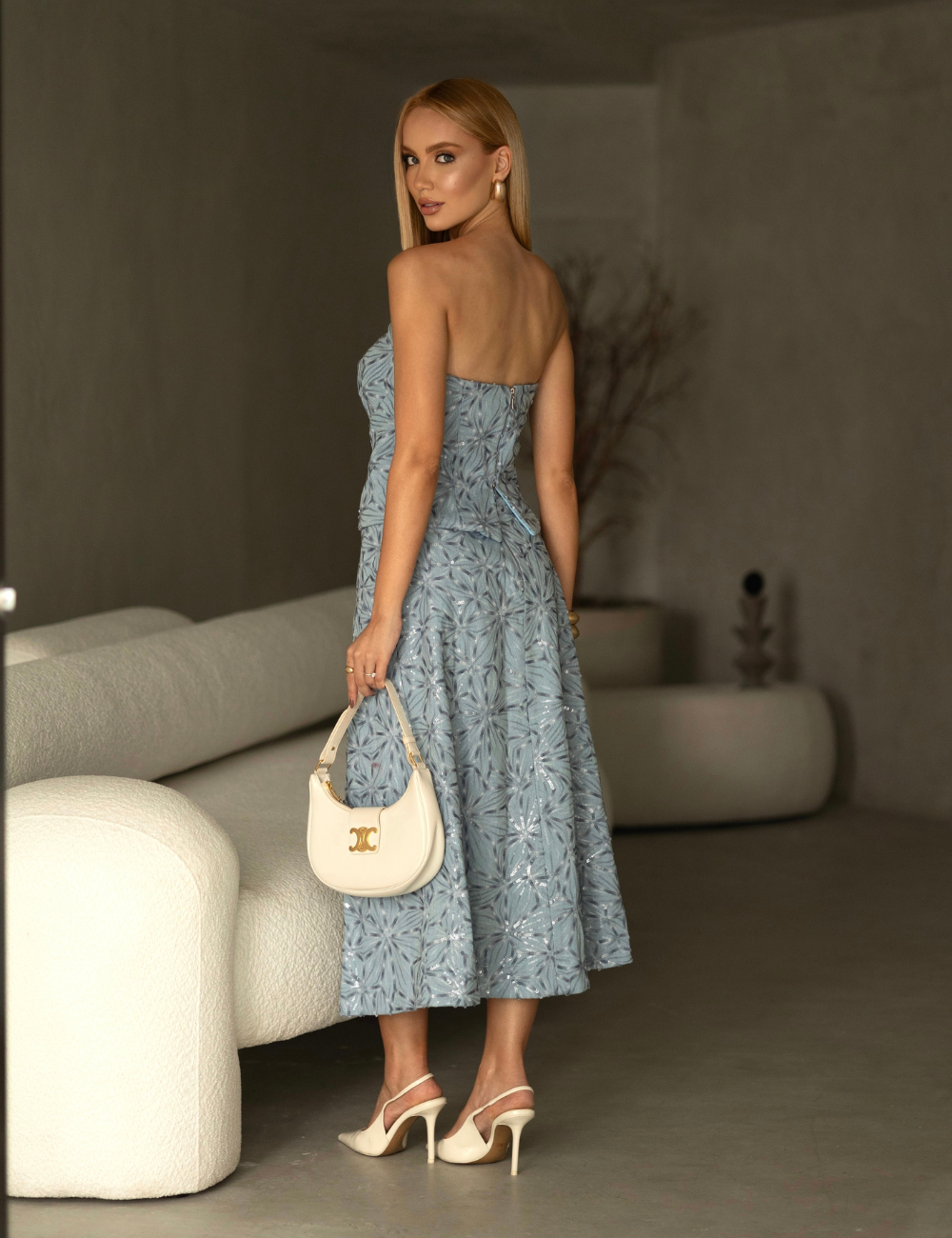 A blusa apresenta modelagem justa e comprimento padrão. É um modelo sem alças, com recortes no busto, bojo embutido para sustentação e fechamento por zíper de metal nas costas. A saia, com modelagem evasê e comprimento midi, valoriza a silhueta com movimento e elegância. Possui cintura alta, forro embutido e fechamento por zíper invisível nas costas.