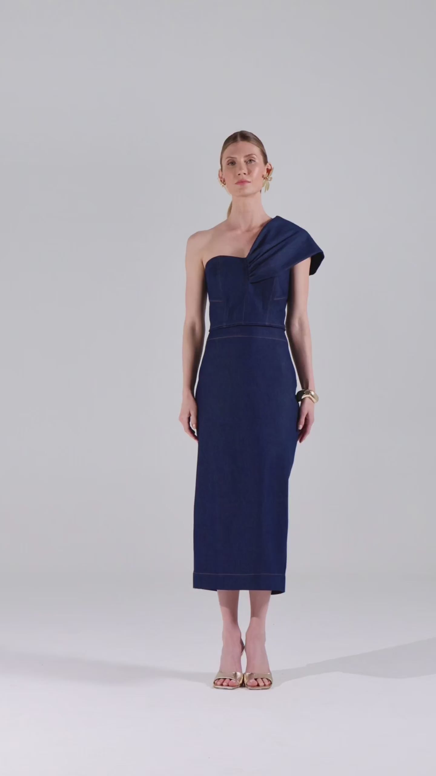 O conjunto jeans com top e saia é confeccionado em algodão com poliéster. O tecido estruturado e confortável garante caimento impecável e estilo contemporâneo.