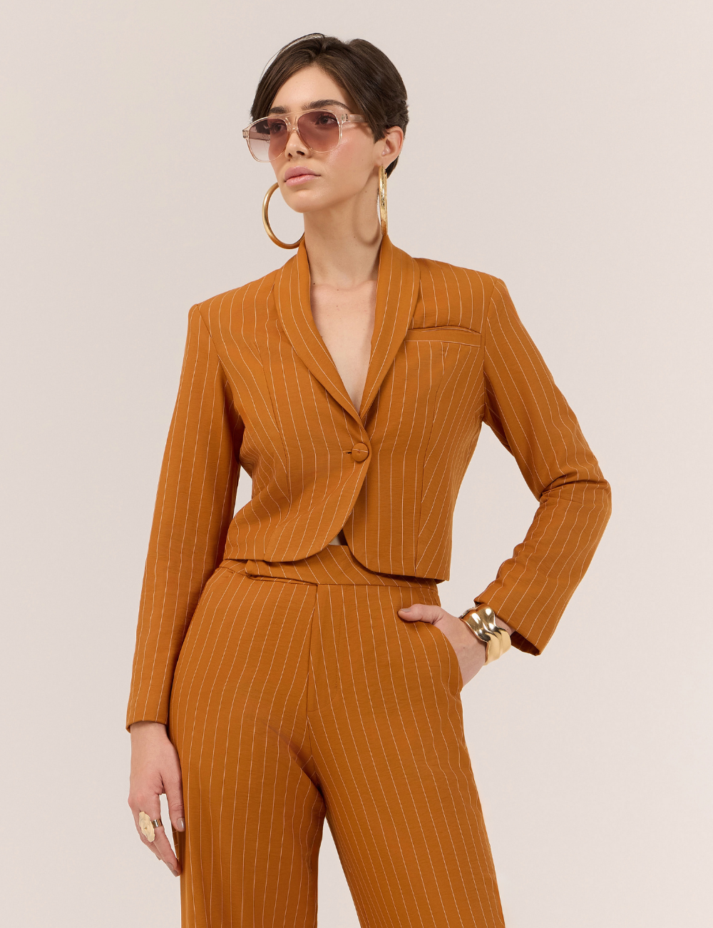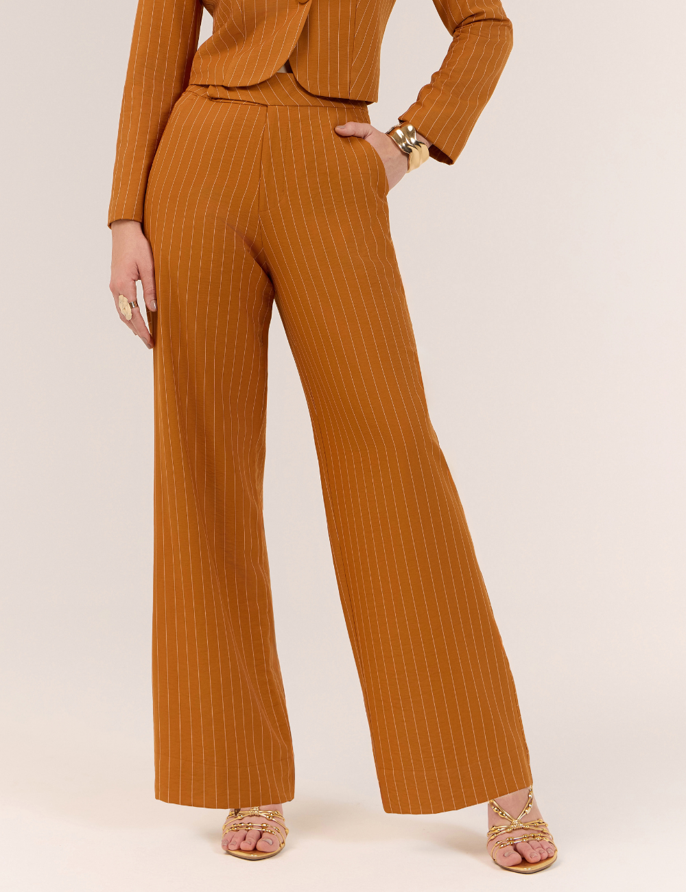 O conjunto laranja risca de giz é confeccionado em viscose . O tecido é leve e confortável , garantindo um caimento sofisticado e elegante.