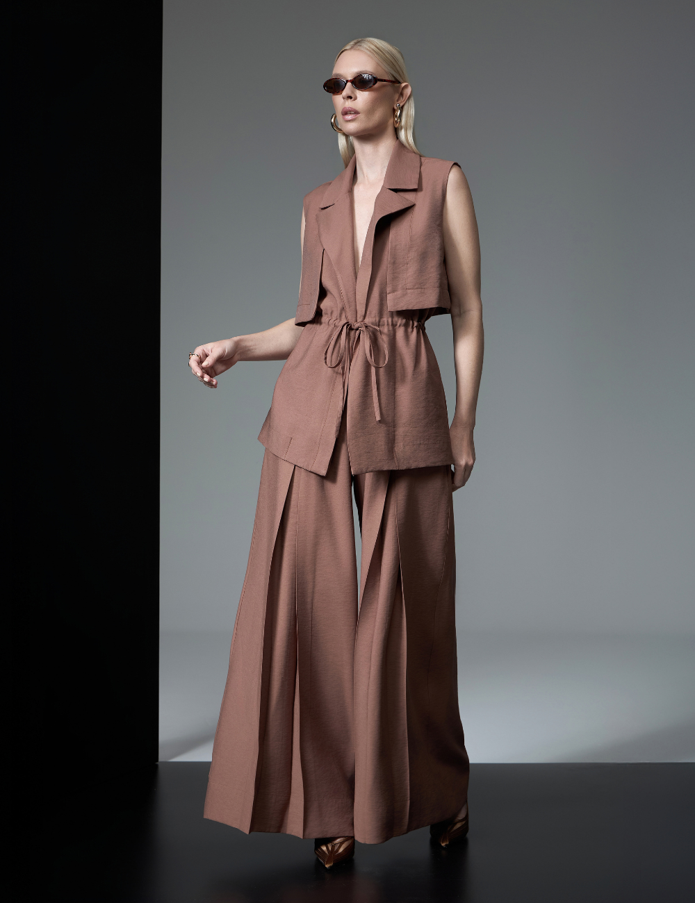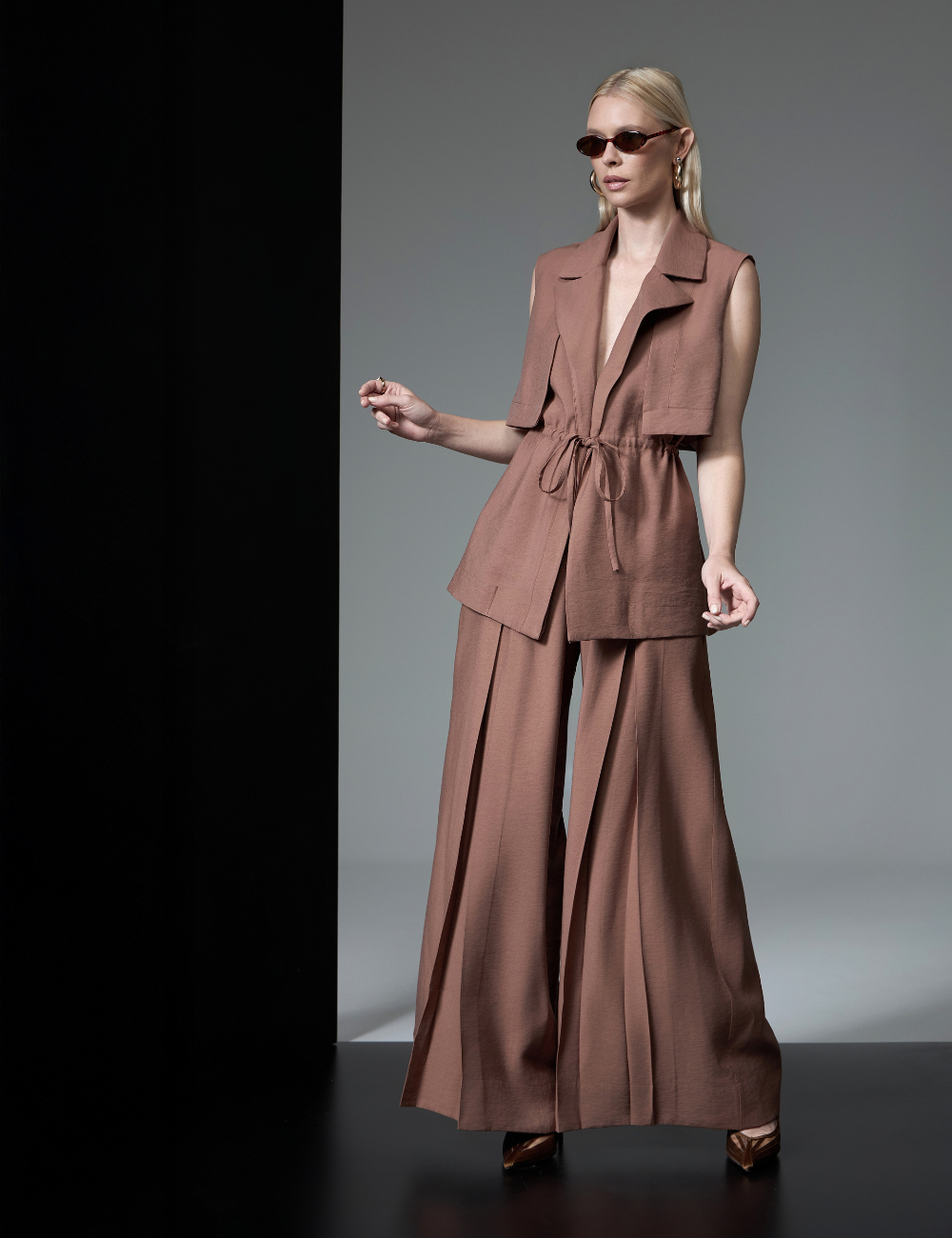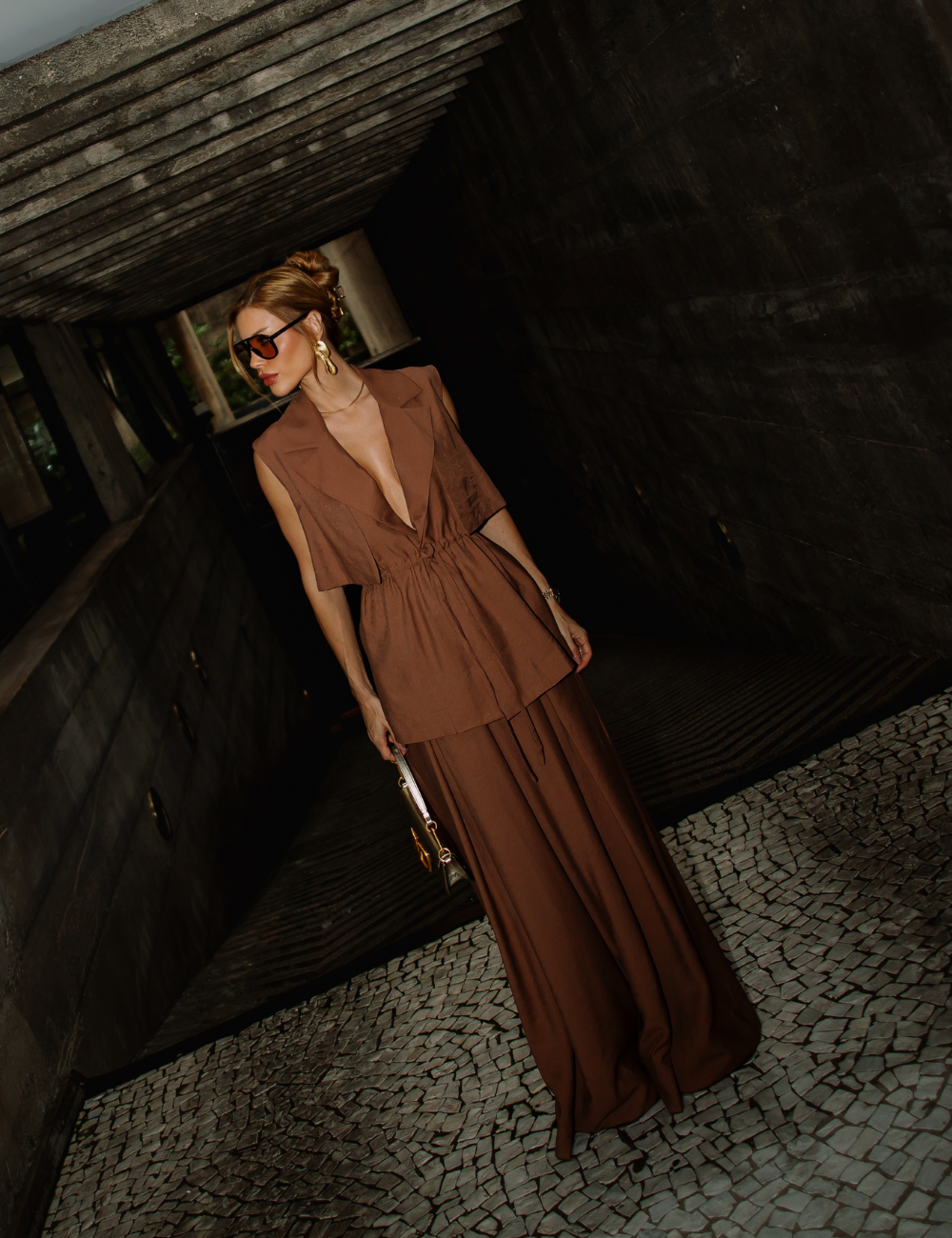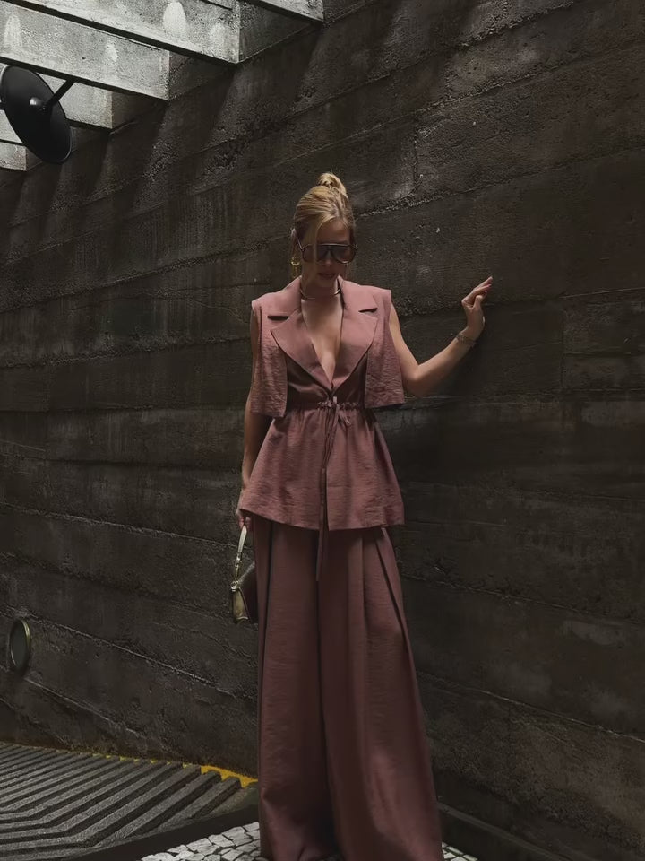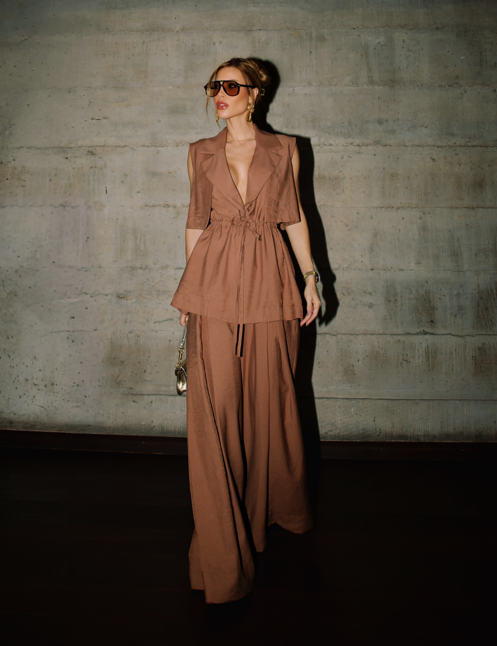 O conjunto marrom com amarração é confeccionado em viscose. O tecido leve e confortável garante caimento fluido, proporcionando elegância e sofisticação ao visual.