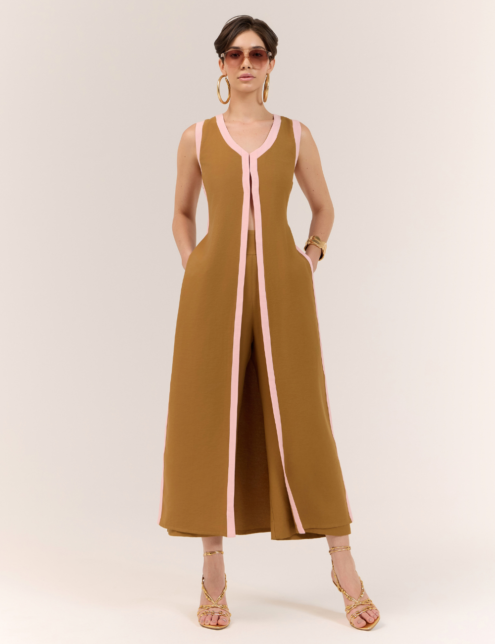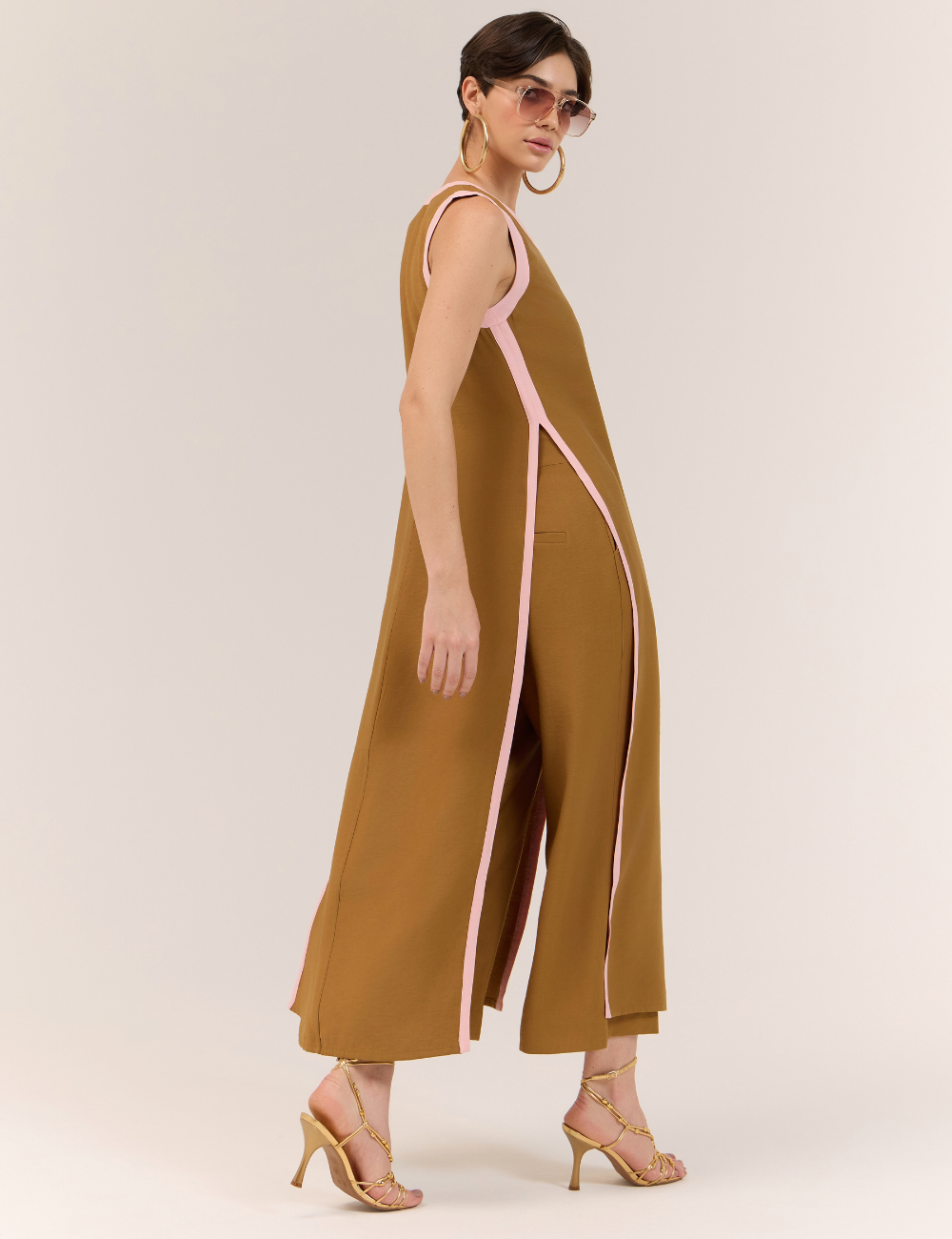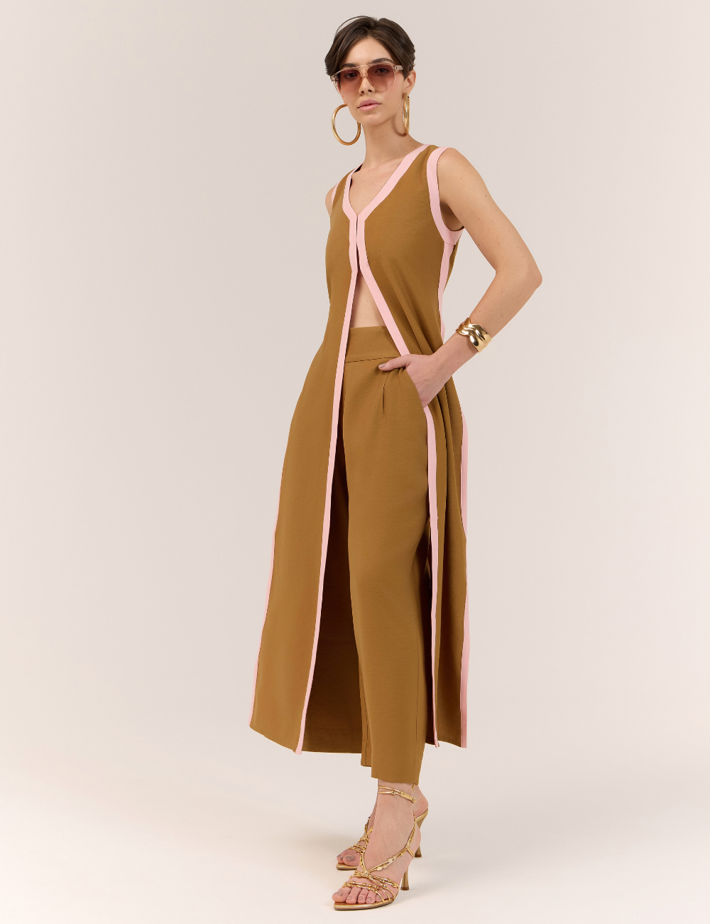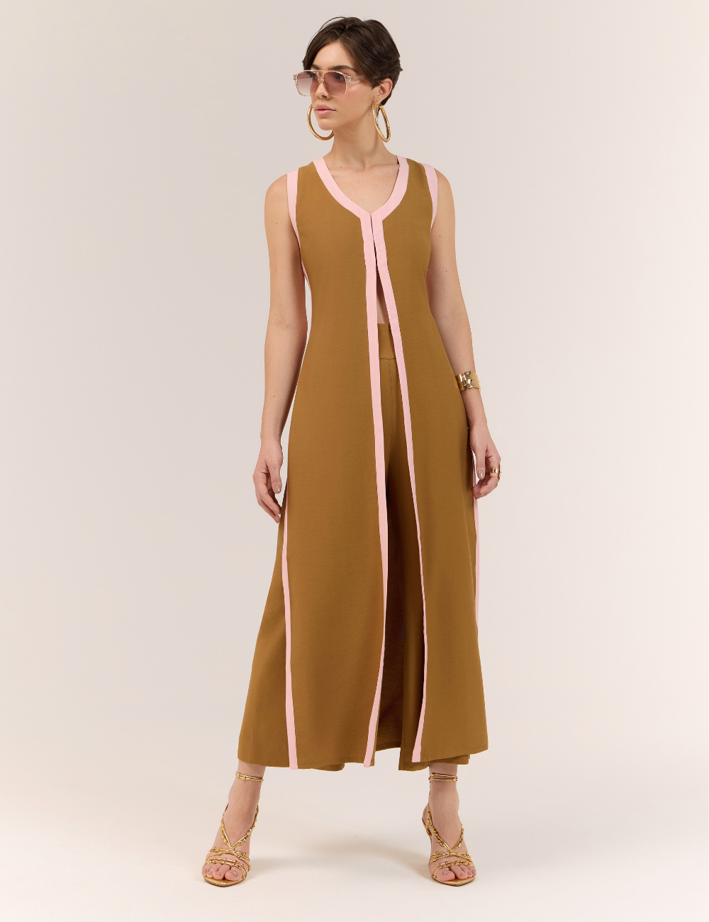 O conjunto marrom com blusa alongada e calça é confeccionado em viscose, tecido leve e confortável, que oferece caimento fluido com toque sofisticado. O diferencial fica por conta do viés contrastante em marrom, que adiciona modernidade e personalidade ao visual.