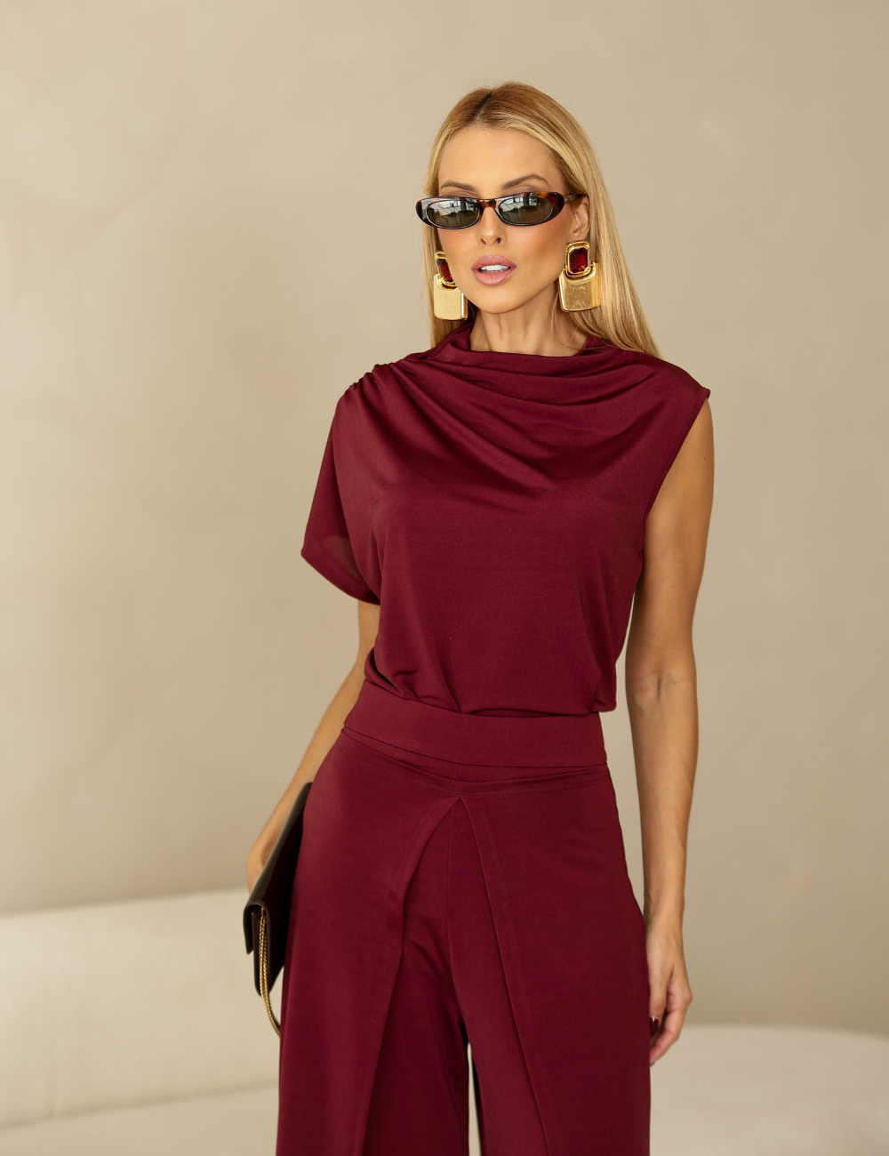 A blusa apresenta modelagem reta e comprimento padrão . O modelo conta com gola alta com níveis franzidos e manga assimétrica , que adicionam sofisticação e informação de moda à peça. A calça apresenta modelagem pantalona e shape amplo , proporcionando movimento e fluidez . Possui cintura alta , cós largo e detalhe de sobre saia , trazendo modernidade ao design. Conta ainda com forro embutido e fechamento por zíper invisível nas costas , garantindo melhor ajuste e conforto ao vestir .