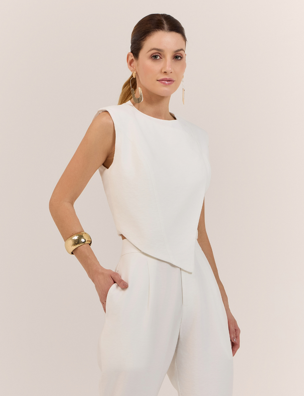 O conjunto off white assimétrico é confeccionado em viscose, tecido leve e confortável que proporciona fluidez e sofisticação ao visual. A peça une design moderno e caimento impecável, ideal para quem busca estilo com personalidade.