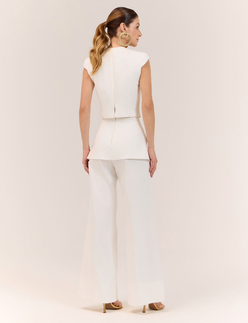 A calça conta com modelagem reta e shape amplo. Apresenta cintura alta, basque com detalhe em lapela, cós largo, pregas frontais, bolsos quadrados nas costas e bainha larga. O fechamento por zíper invisível na lateral garante praticidade e acabamento refinado.