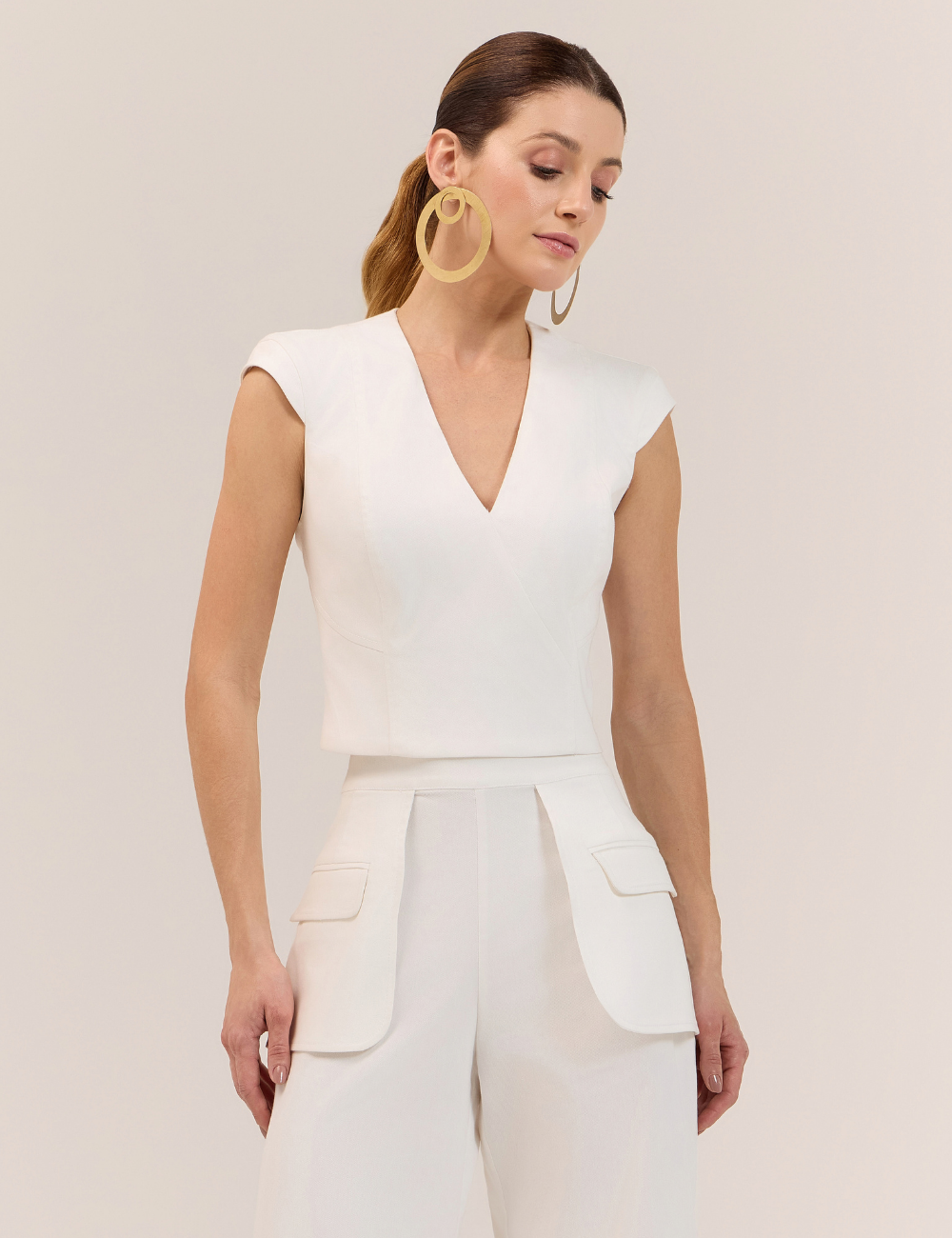 A blusa apresenta modelagem justa e comprimento cropped. Possui decote em V, recortes estruturados, ombreiras para sustentação e forro embutido, além de fechamento por zíper invisível nas costas.