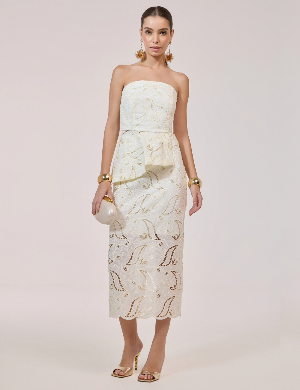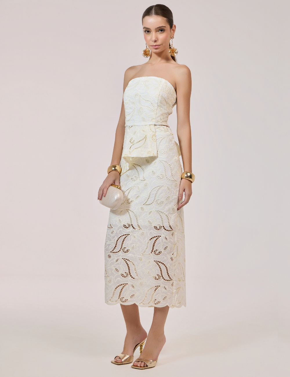 O conjunto off white com bordados é confeccionado em algodão. O tecido é estruturado e confere sofisticação à produção. A peça se destaca pelos bordados com renda de entremeio, que adicionam delicadeza e valorizam o visual.