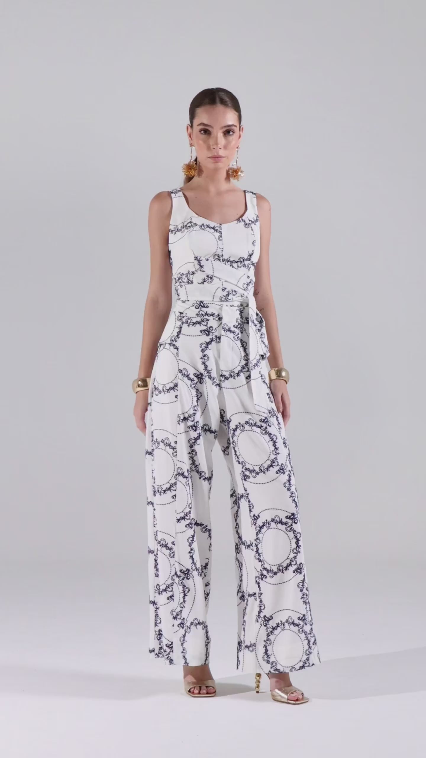 O conjunto off white com bordados circulares é confeccionado em viscolinho. A peça se destaca pelos bordados aplicados diretamente no tecido, que enriquecem a produção e trazem sofisticação ao look.
