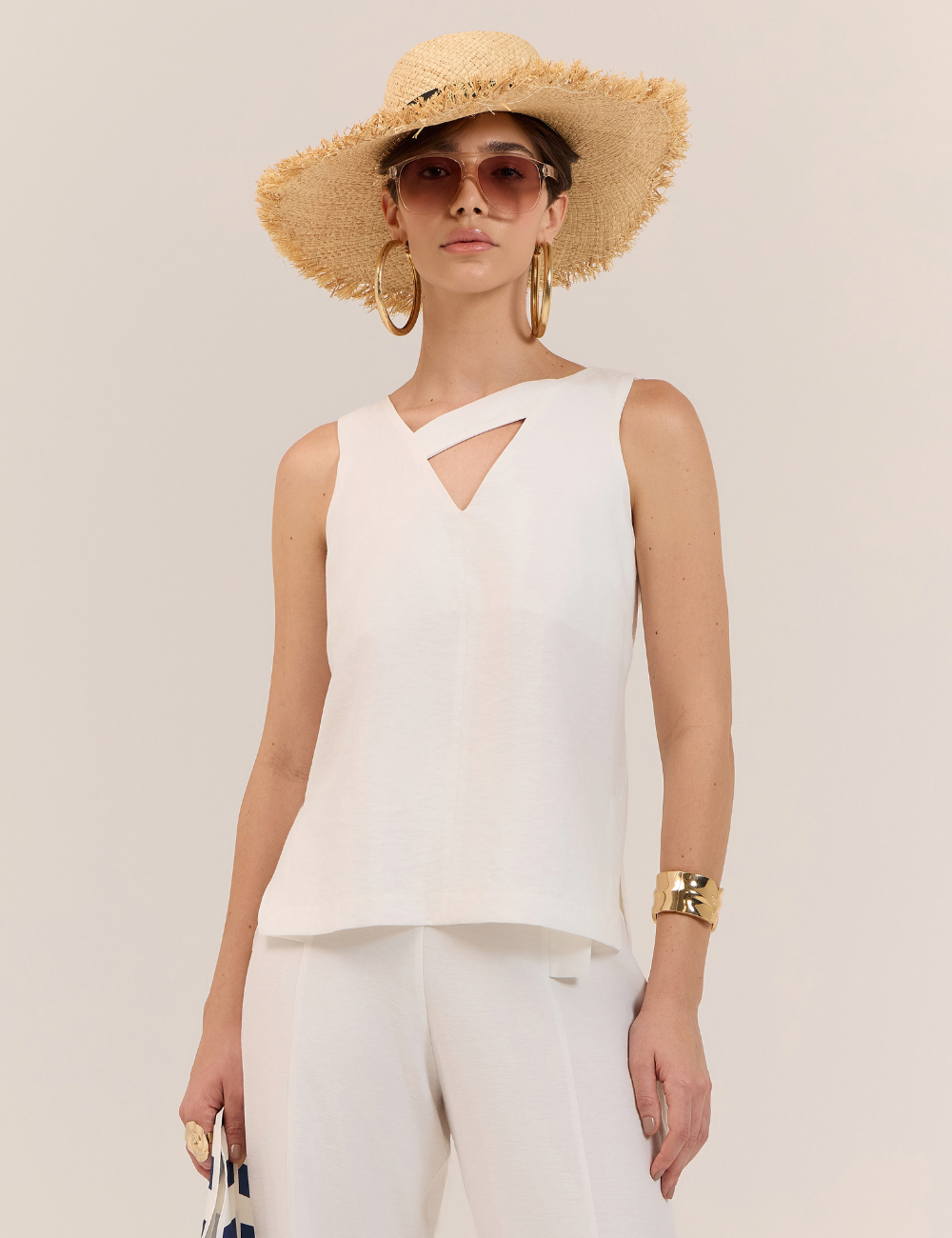 A blusa apresenta modelagem reta e comprimento padrão . Possui alças largas , decotes em V com detalhe em tira e fenda lateral , que conferem modernidade e charme à peça.