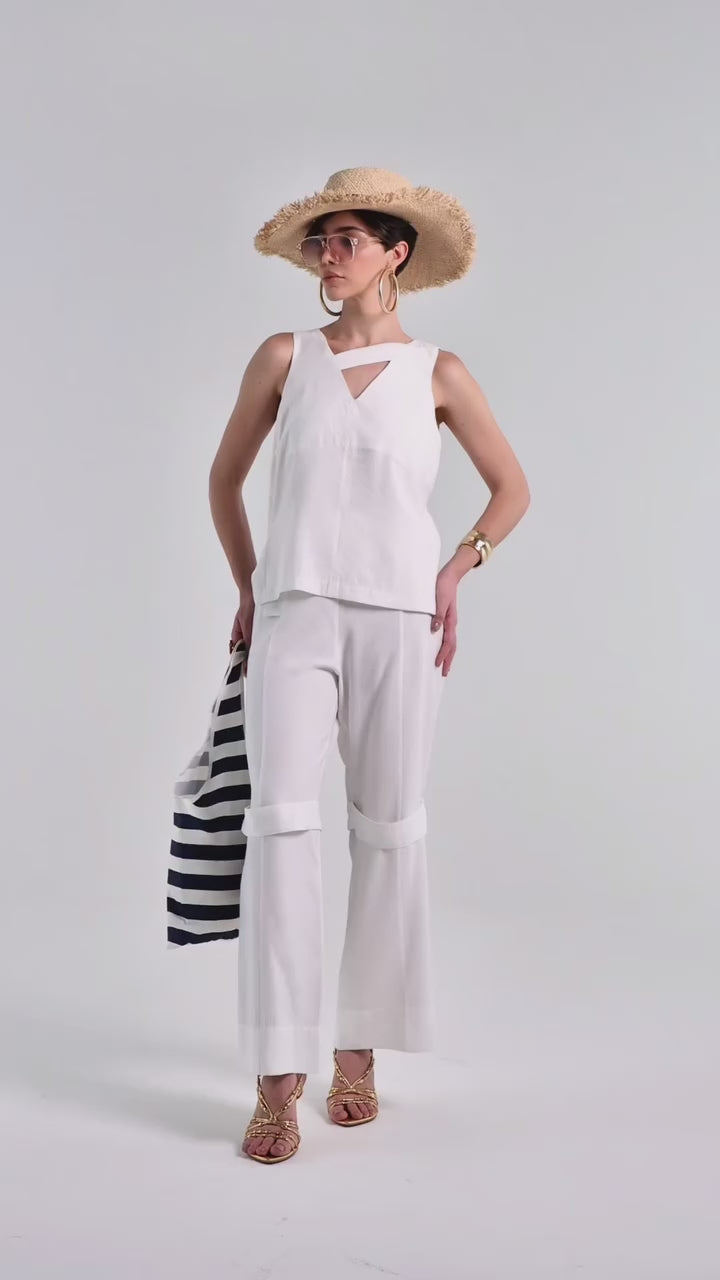 O conjunto off white com tiras é confeccionado em viscose . O tecido é leve e confortável , proporcionando caimento fluido e sofisticação.