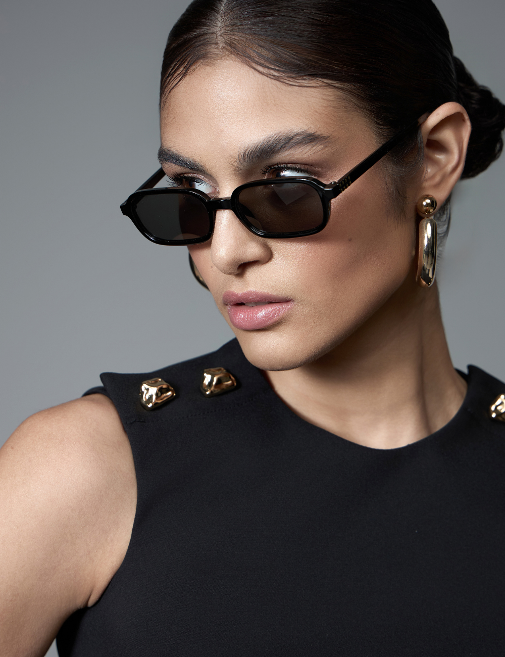 • Botões dourados nos ombros