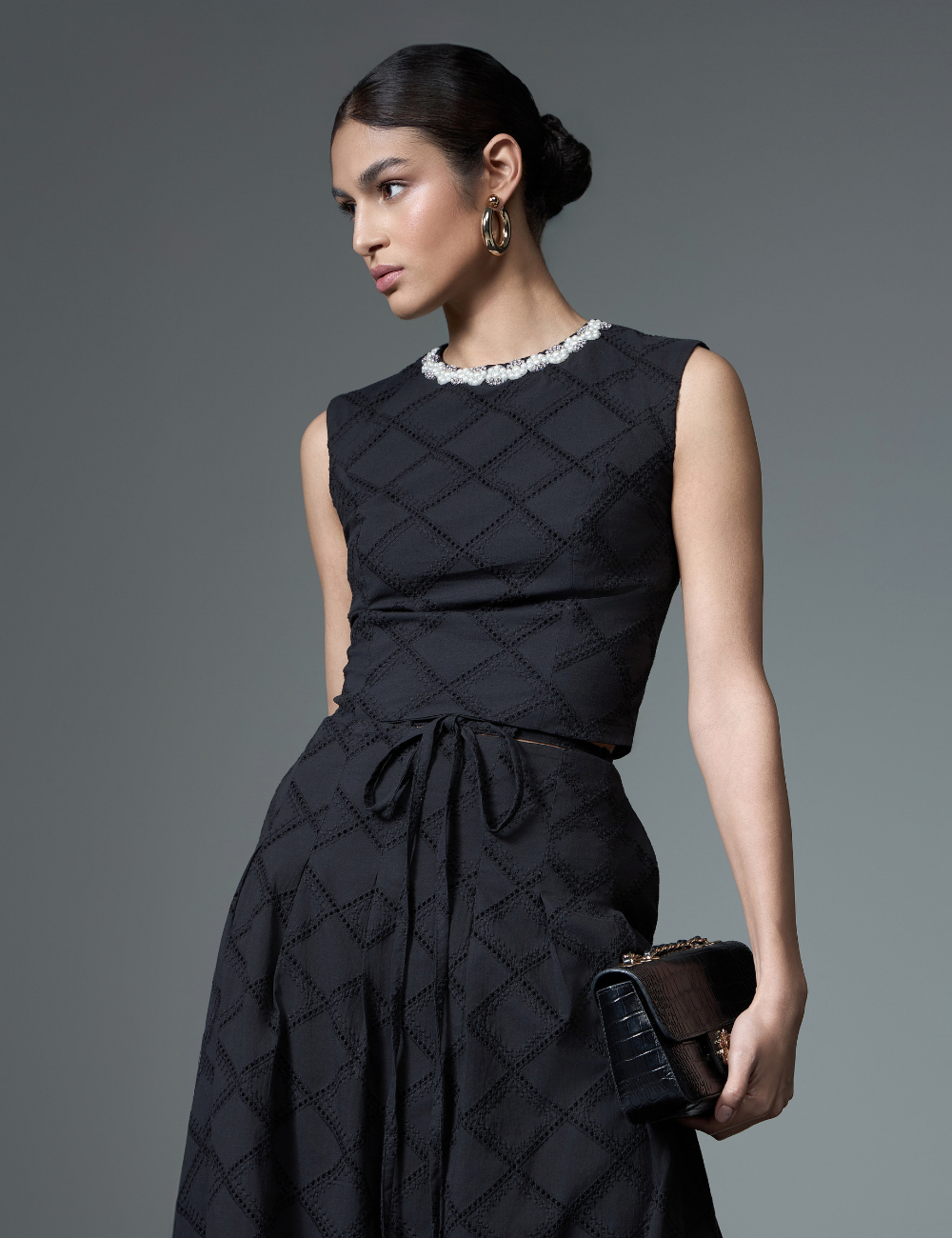 O conjunto preto com bordados e pérolas é confeccionado em algodão. O tecido é leve e confortável, destacando-se pelos bordados delicados que tornam a peça ainda mais especial.