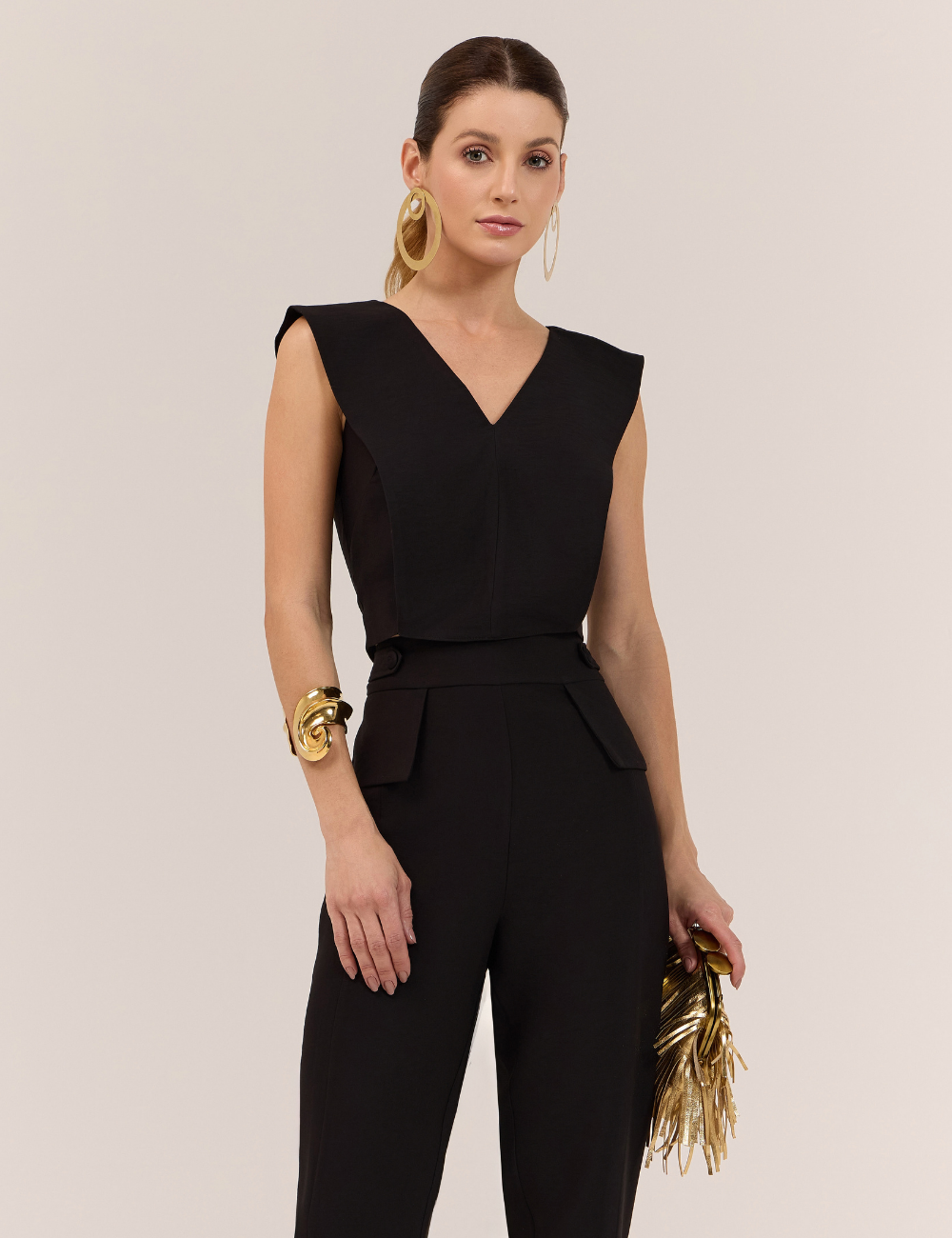 A calça possui modelagem cenoura e shape soltinho , com cintura alta , cós largo , detalhe em botões na cintura , além de basque no quadril e fenda na barra , que adicionam movimento e modernidade ao design. O fechamento por zíper invisível nas costas garante acabamento refinado.