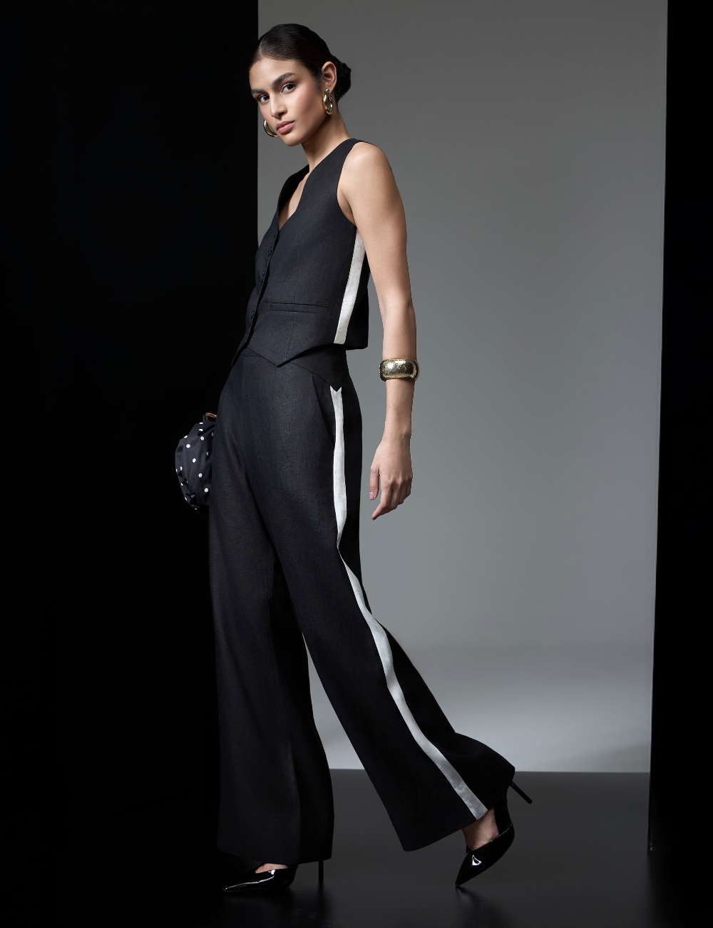 O conjunto preto em linho com recortes é confeccionado em linho puro, um tecido leve, confortável e de toque natural, ideal para compor produções elegantes e frescas, com sofisticação atemporal.