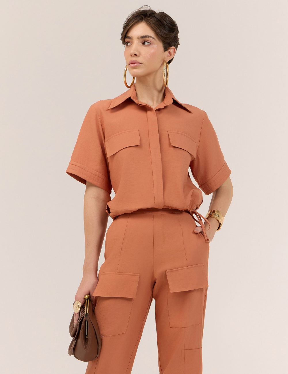 Perfeito para composições que unem funcionalidade e estilo, o conjunto terracota utilitário é ideal para looks casuais sofisticados.