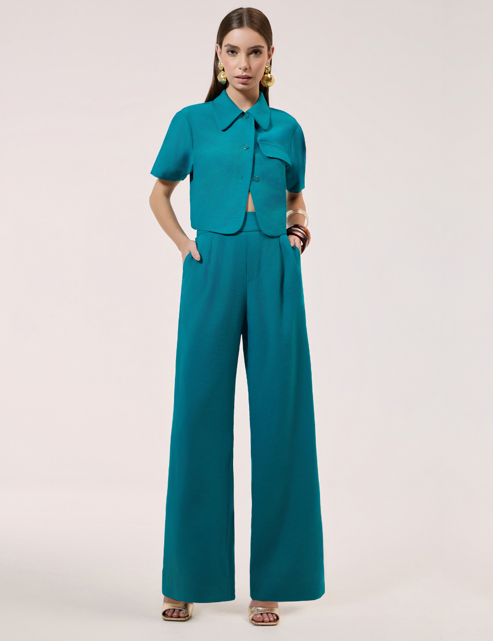O conjunto turquesa com camisa e calça reta é confeccionado em viscose, tecido leve e confortável que garante frescor e sofisticação ao visual. A proposta é elegante e elegante com um toque contemporâneo.