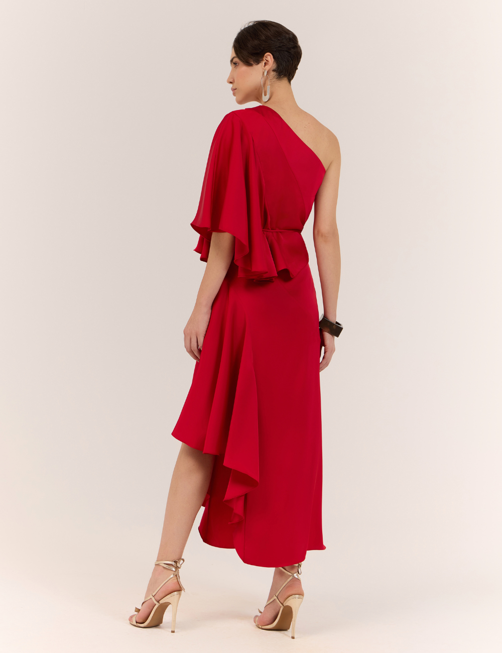 O Conjunto vermelho assimétrico é confeccionado em cetim leve, com toque macio e acabamento acetinado, que confere brilho e sofisticação à produção. A blusa apresenta modelagem assimétrica com recortes, garantindo melhor estrutura à peça, além de ombro único, manga morcego ampla e detalhe em amarração na cintura, que permite melhor adaptação ao corpo. A saia possui comprimento midi, modelagem assimétrica e cintura alta, com recorte lateral e leves babados que trazem fluidez ao movimento. Conta ainda com forro embutido e fechamento por zíper invisível nas costas.