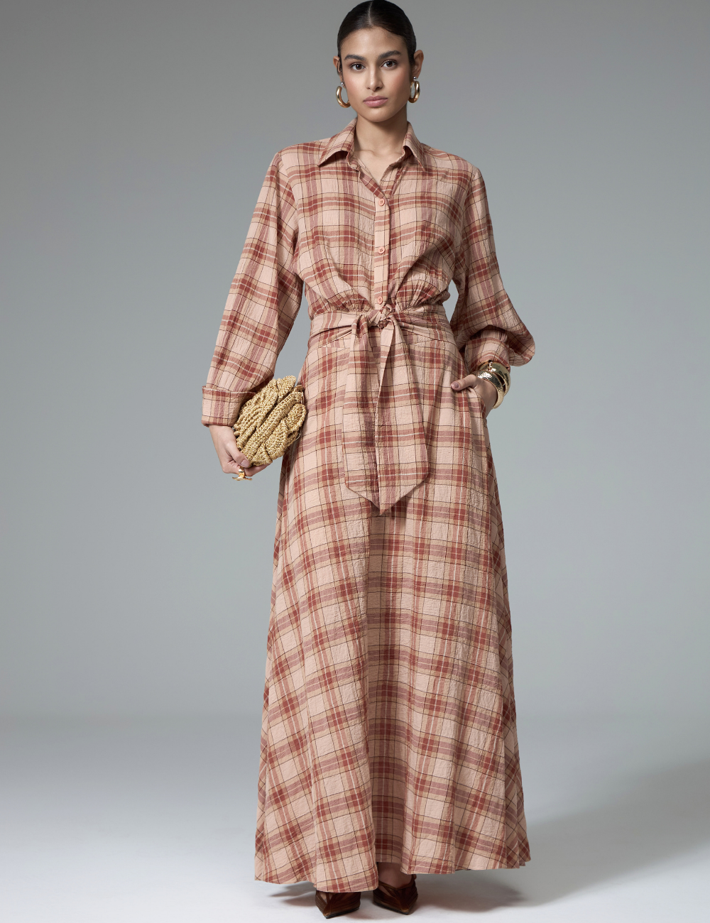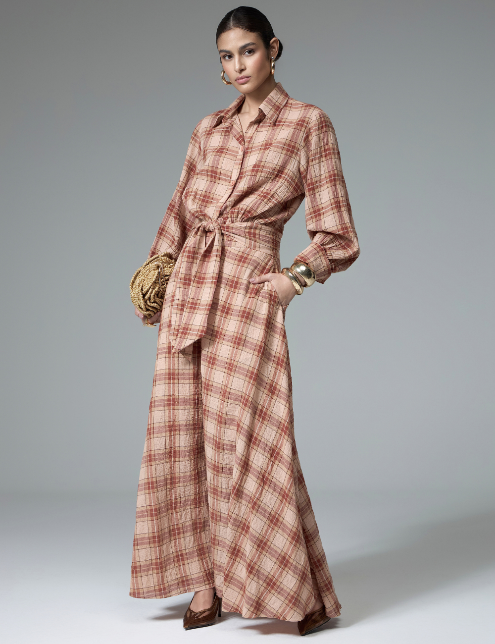 O conjunto xadrez marrom com saia é confeccionado em algodão, com tecido leve e confortável, ideal para produções elegantes com toque moderno.