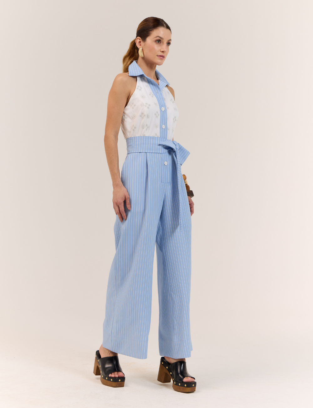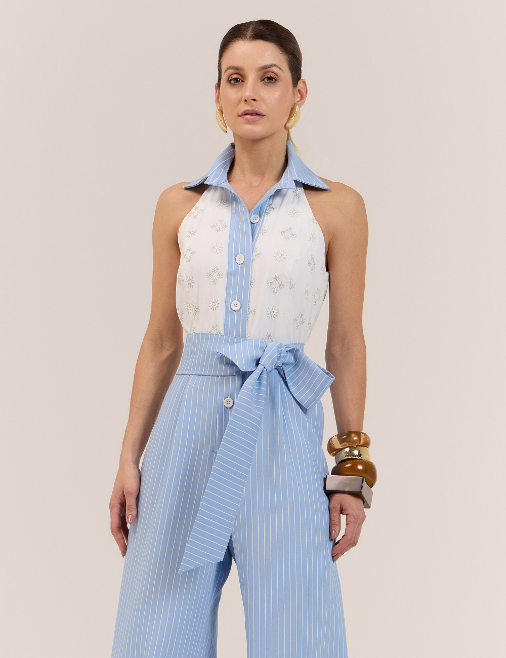 O macacão com bordados e listras é confeccionado em viscose e algodão, tecidos leves e confortáveis que proporcionam toque suave e caimento natural.