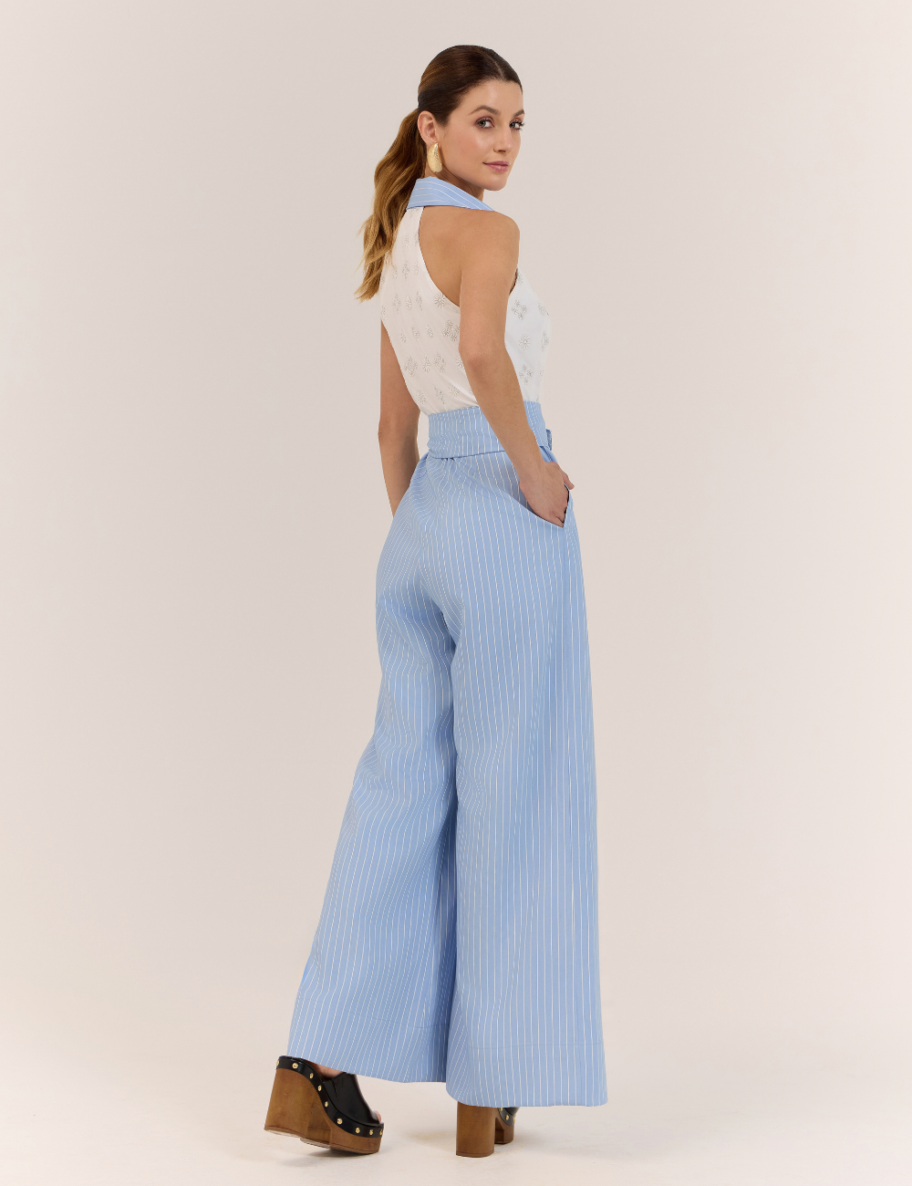 A peça se destaca pelo mix de textura bordada em algodão e estampa listrada em viscose, criando uma combinação autêntica e sofisticada.