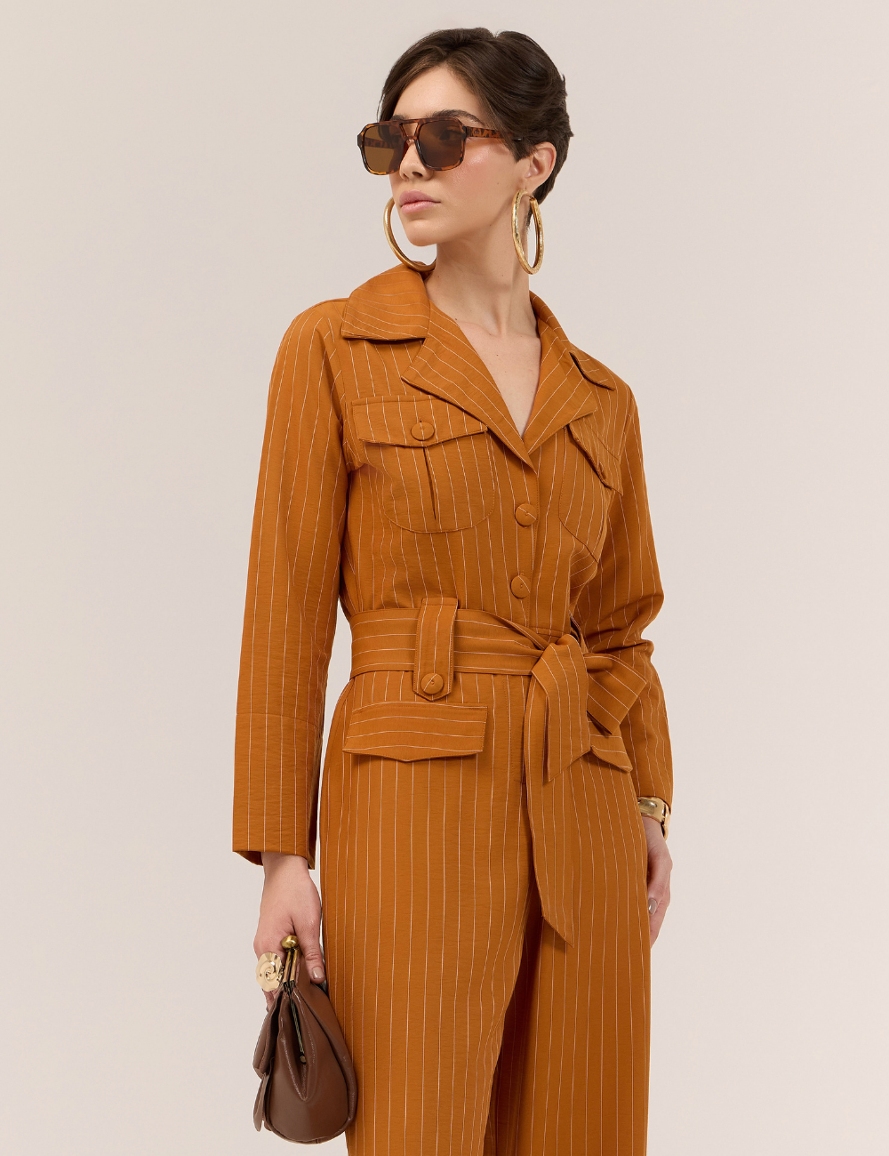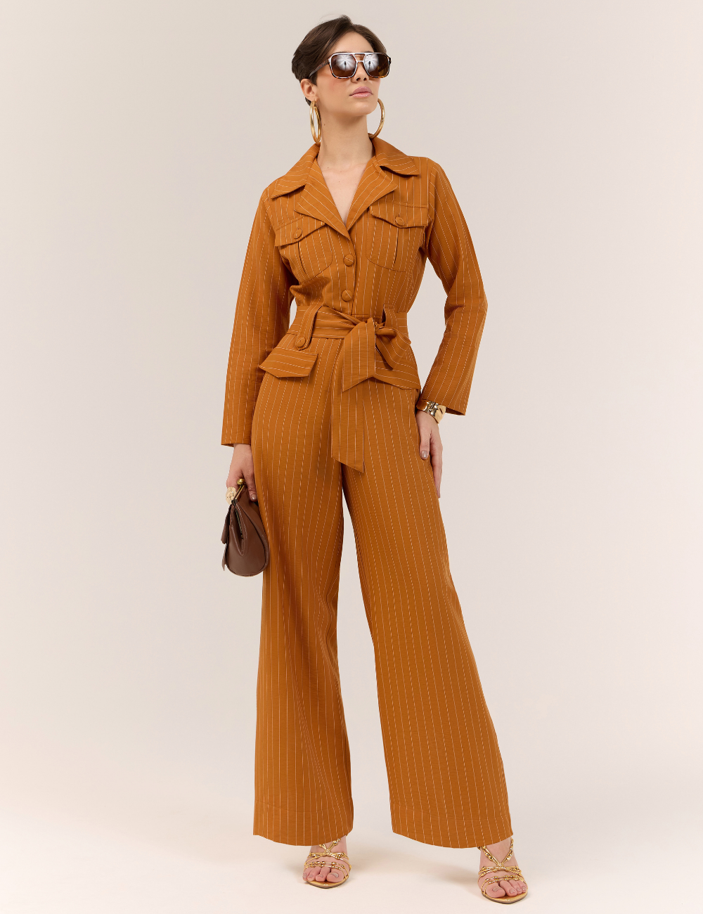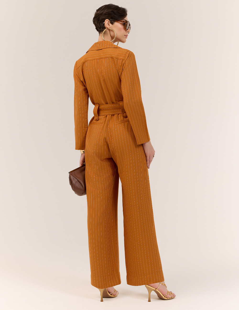 O macacão laranja risca de giz é confeccionado em viscose . O tecido é leve e confortável , proporcionando caimento sofisticado e moderno.