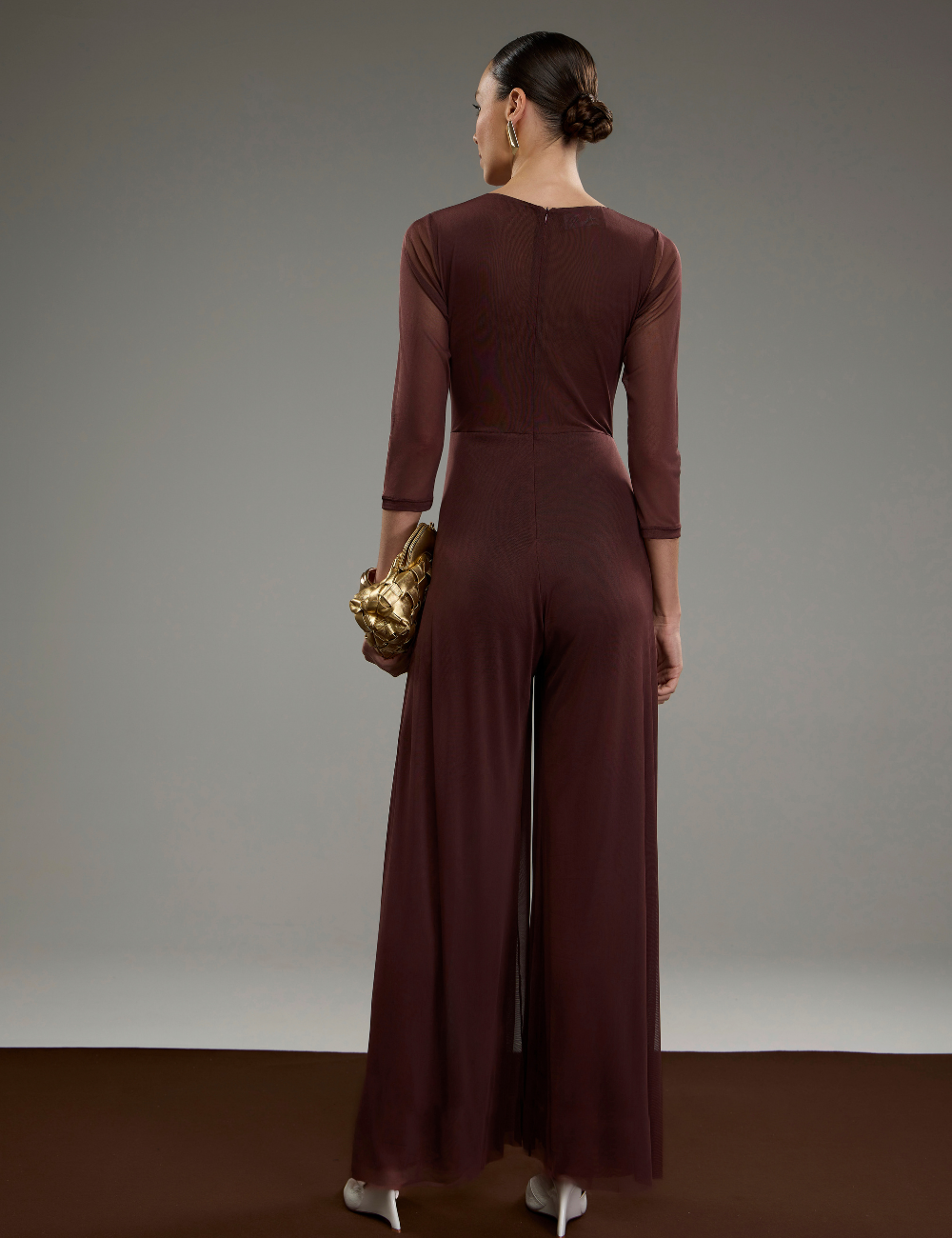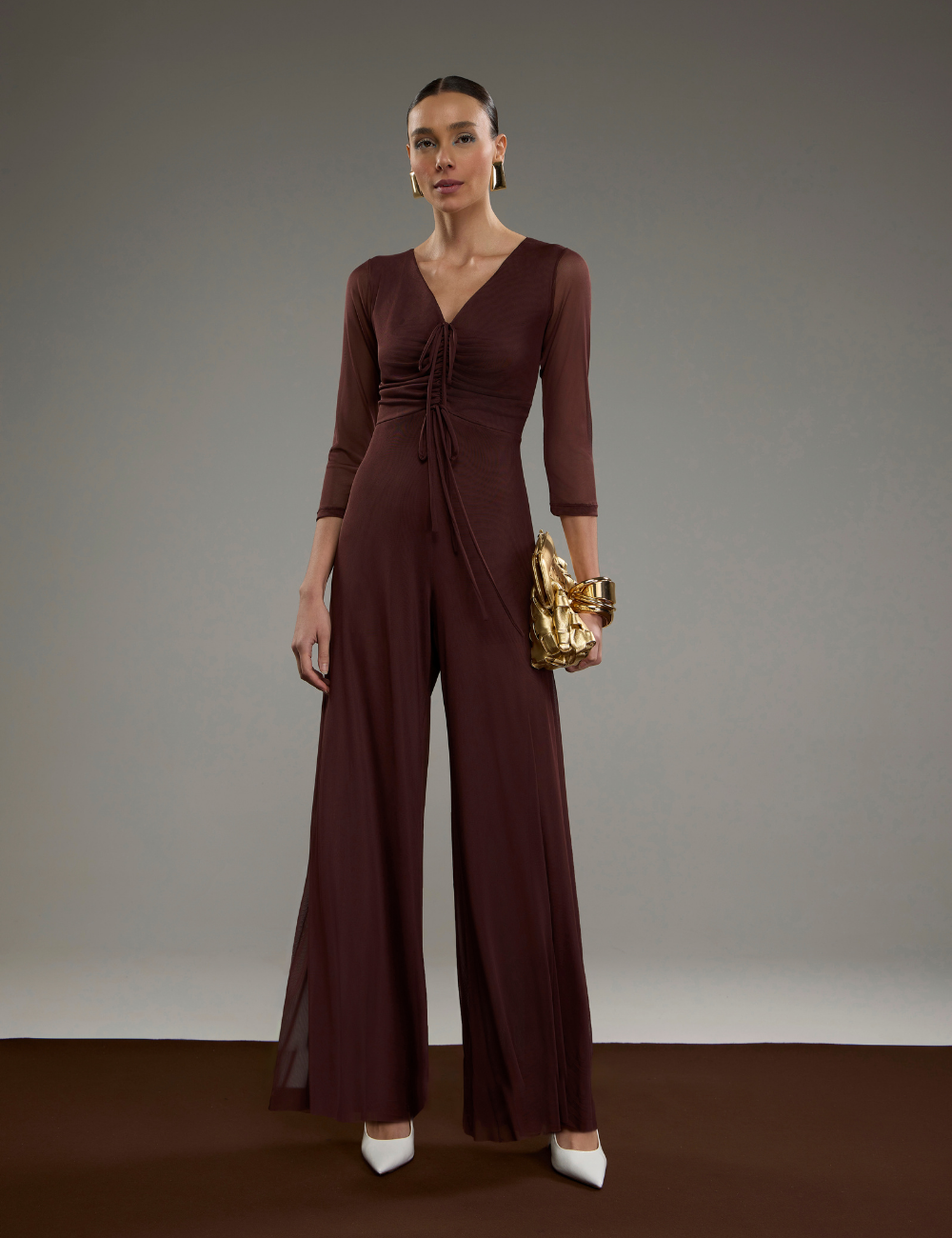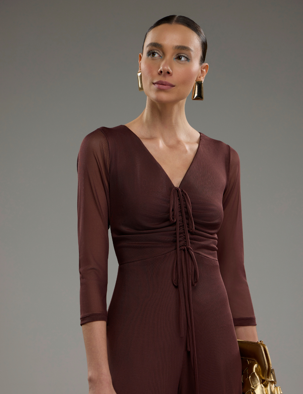 O macacão marrom em tule com amarração é confeccionado em tule, um tecido leve e com transparência que garante um visual sofisticado e contemporâneo.