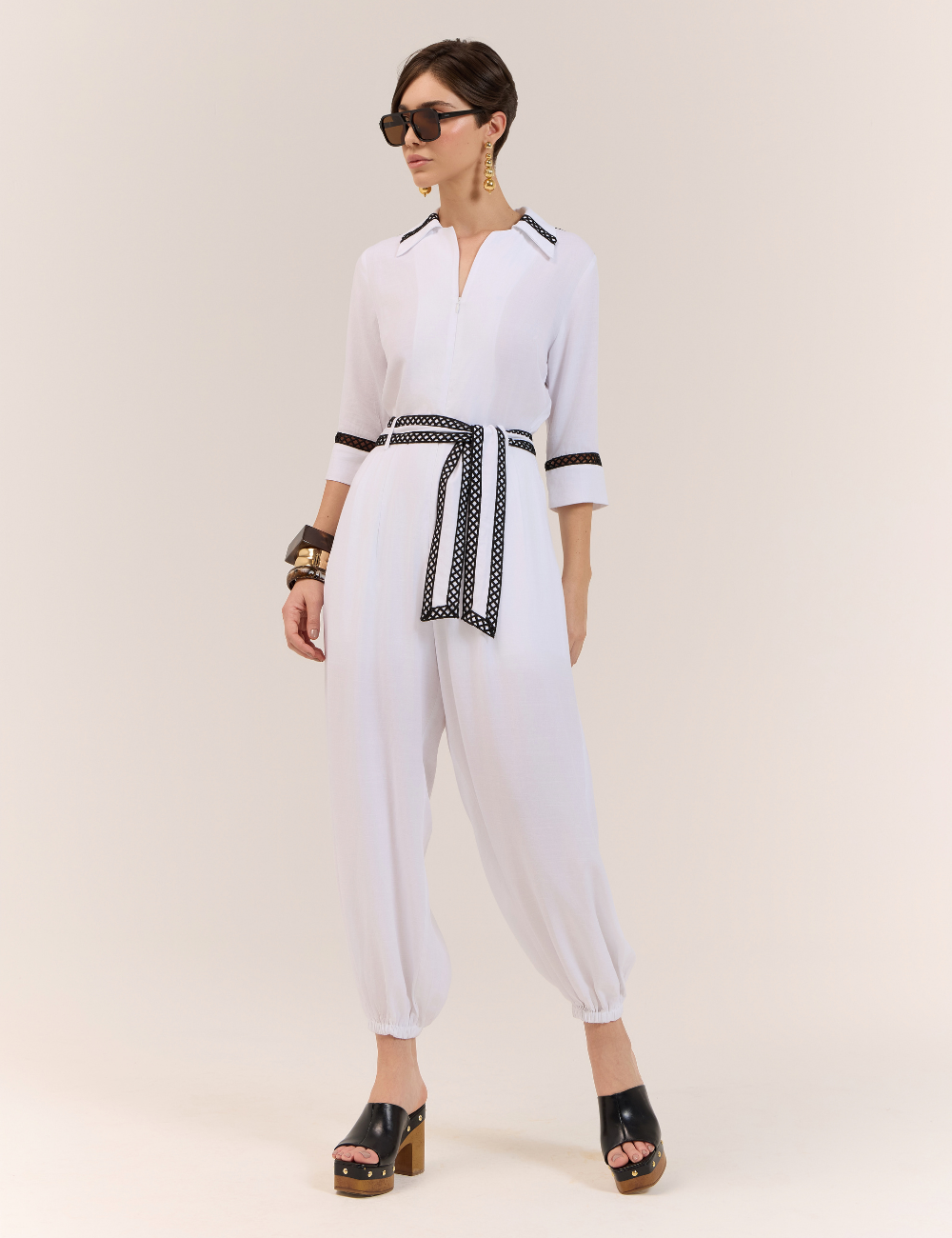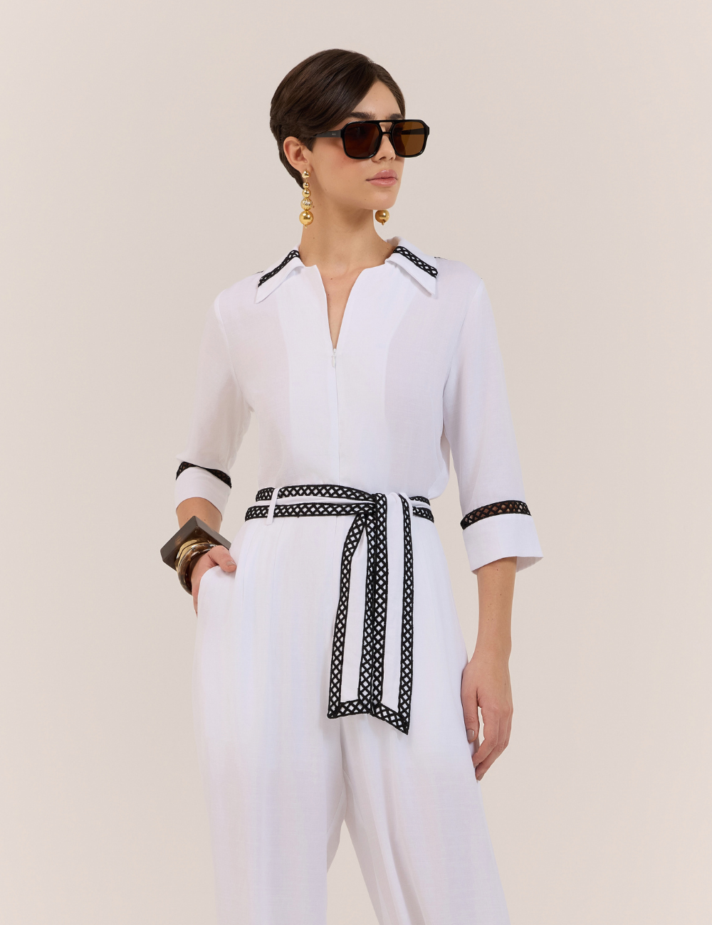 O macacão off white com detalhe em renda é confeccionado em viscose, um tecido leve e confortável que oferece caimento fluido e elegante.