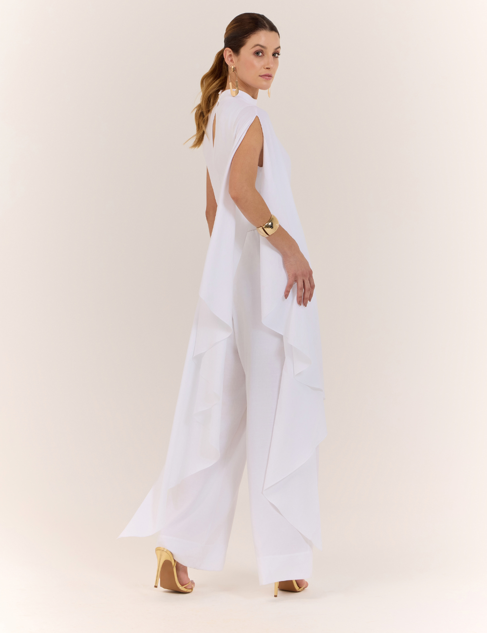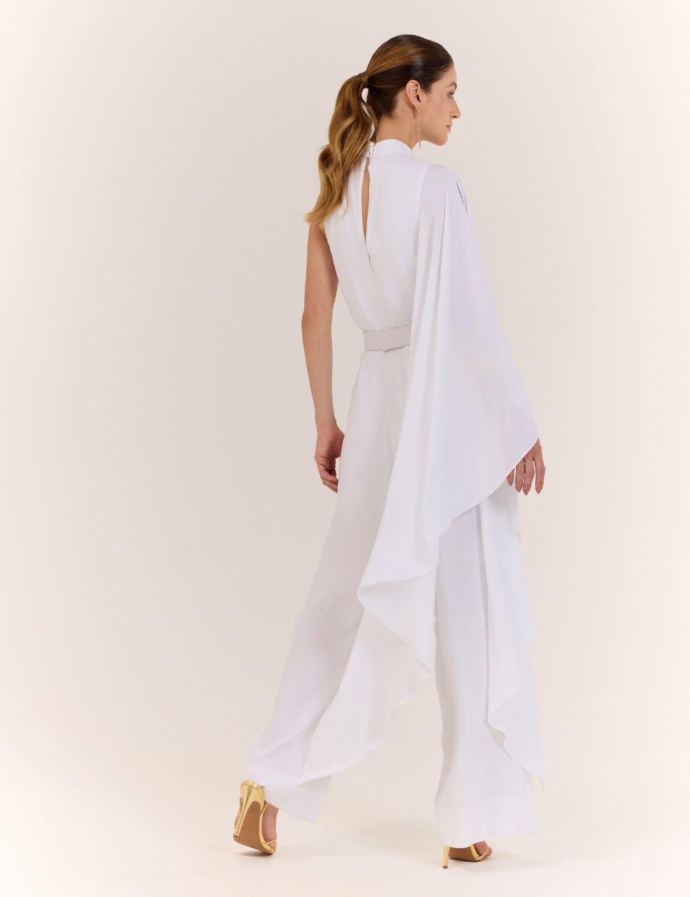 O macacão off white com manga assimétrica é confeccionado em viscose . O tecido é leve e confortável, garantindo um caimento sofisticado e moderno. Apresenta modelagem reta e se destaca pelo mangá único assimétrico , que traz movimento e modernidade ao visual. Possui gola alta , cava americana , elástico na cintura para melhor adaptação da peça ao corpo, bolso faca nas laterais e forro embutido . Acompanha cinto forrado . Fechamento por abotoamento na gola e zíper invisível nas costas .