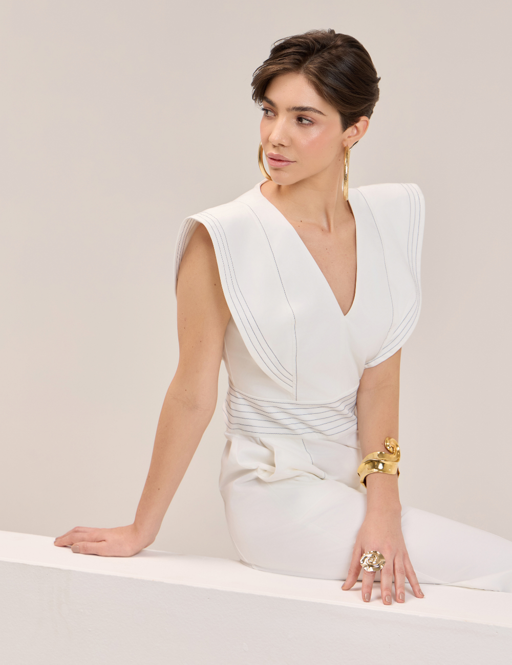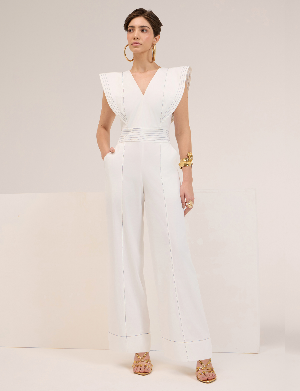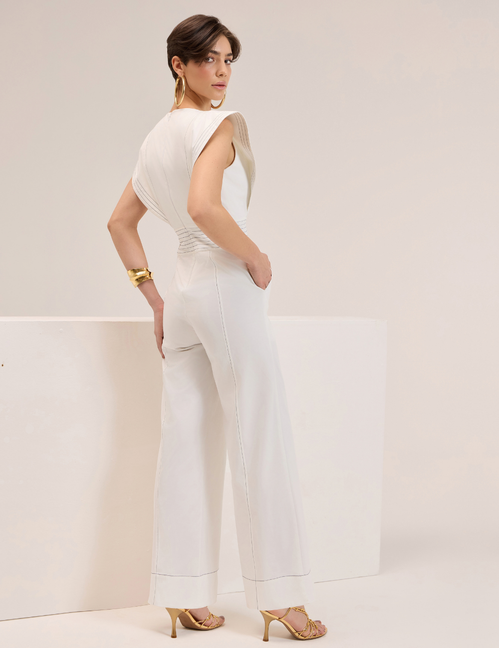 O macacão off white pespontado é confeccionado em algodão com poliéster . O tecido é estruturado e confortável , garantindo caimento impecável e sofisticação.